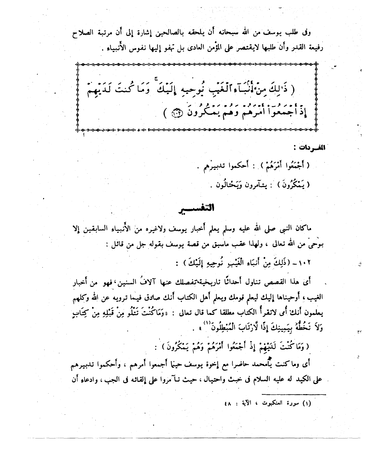 {ذَلِكَ مِنْ أَنْبَاءِ الْغَيْبِ نُوحِيهِ إِلَيْكَ وَمَا كُنْتَ لَدَيْهِمْ إِذْ أَجْمَعُوا أَمْرَهُمْ وَهُمْ يَمْكُرُونَ (102)}
