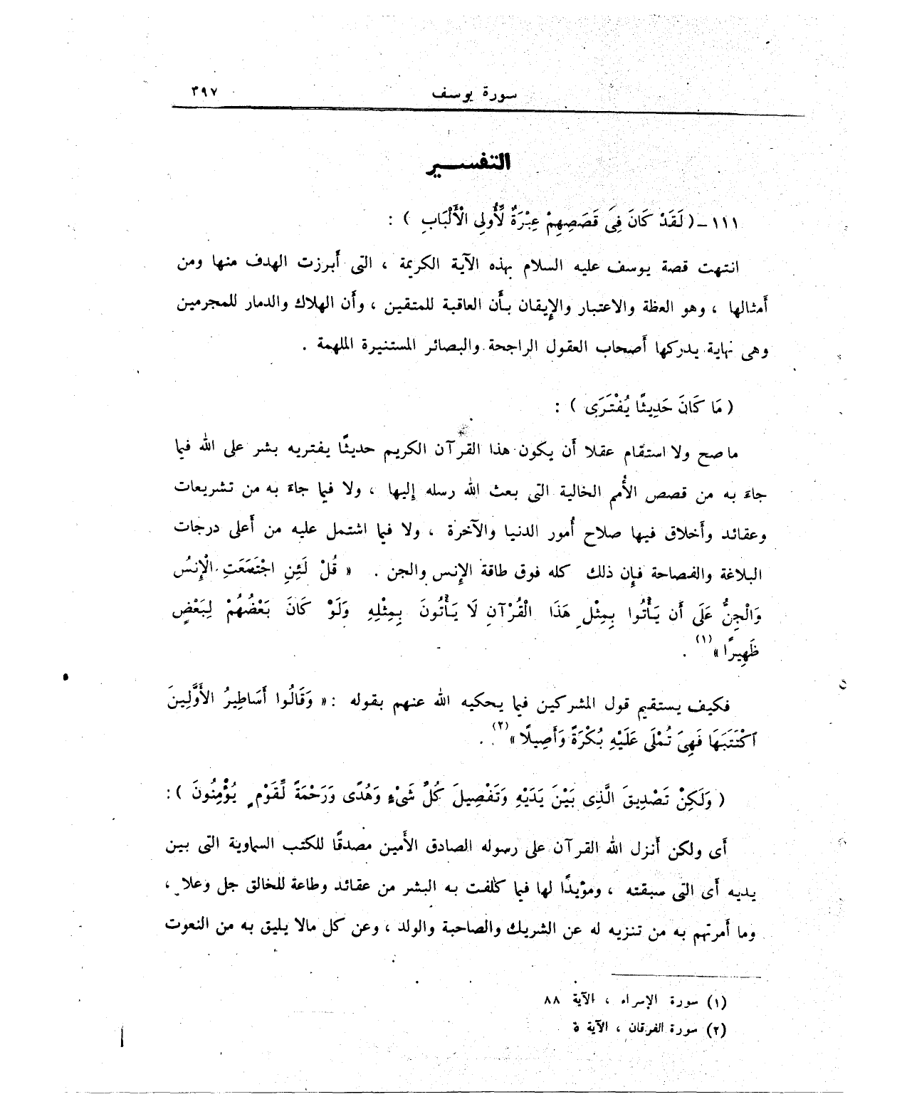 انتهت قصة يوسف عليه السلام بهذه الآية الكريمة، التي أَبرزت الهدف منها ومن أَمثالها، وهو العظة والاعتبار والإِيقان بأَن العاقبة للمتقين، وأَن الهلاك والدمار للمجرمين وهى نهاية يدركها أَصحاب العقول الراجحة والبصائر المستنيرة الملهمة.