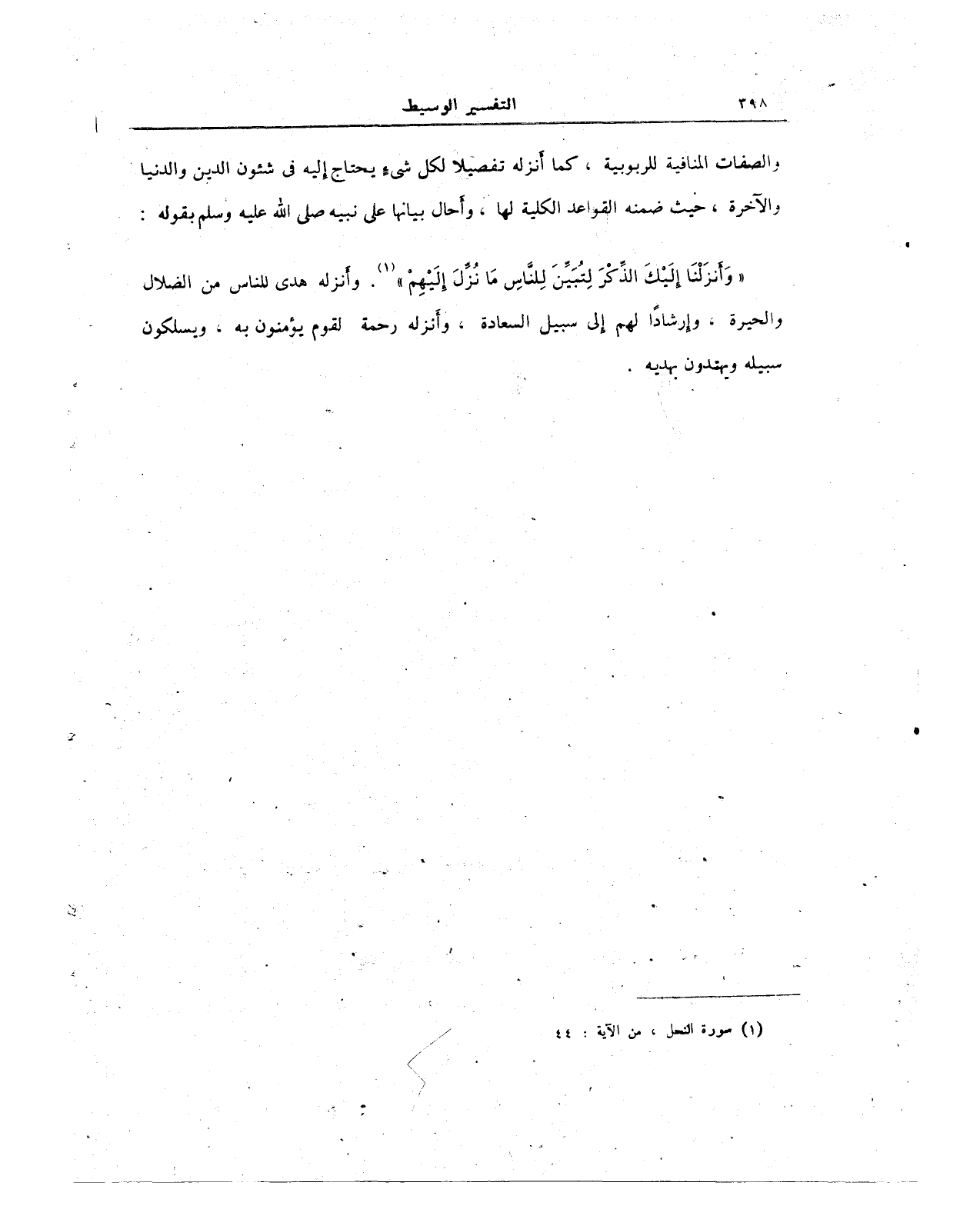 "وَأَنْزَلْنَا إِلَيْكَ الذِّكْرَ لِتُبَيِّنَ لِلنَّاسِ مَا نُزِّلَ إِلَيْهِمْ" (¬1). وأَنزله هدى للناس من الضلال والحيرة، وإِرشادًا لهم إِلى سبيل السعادة، وأَنزله رحمة لقوم يؤمنون به ويسلكون سبيله ويهتدون بهديه.