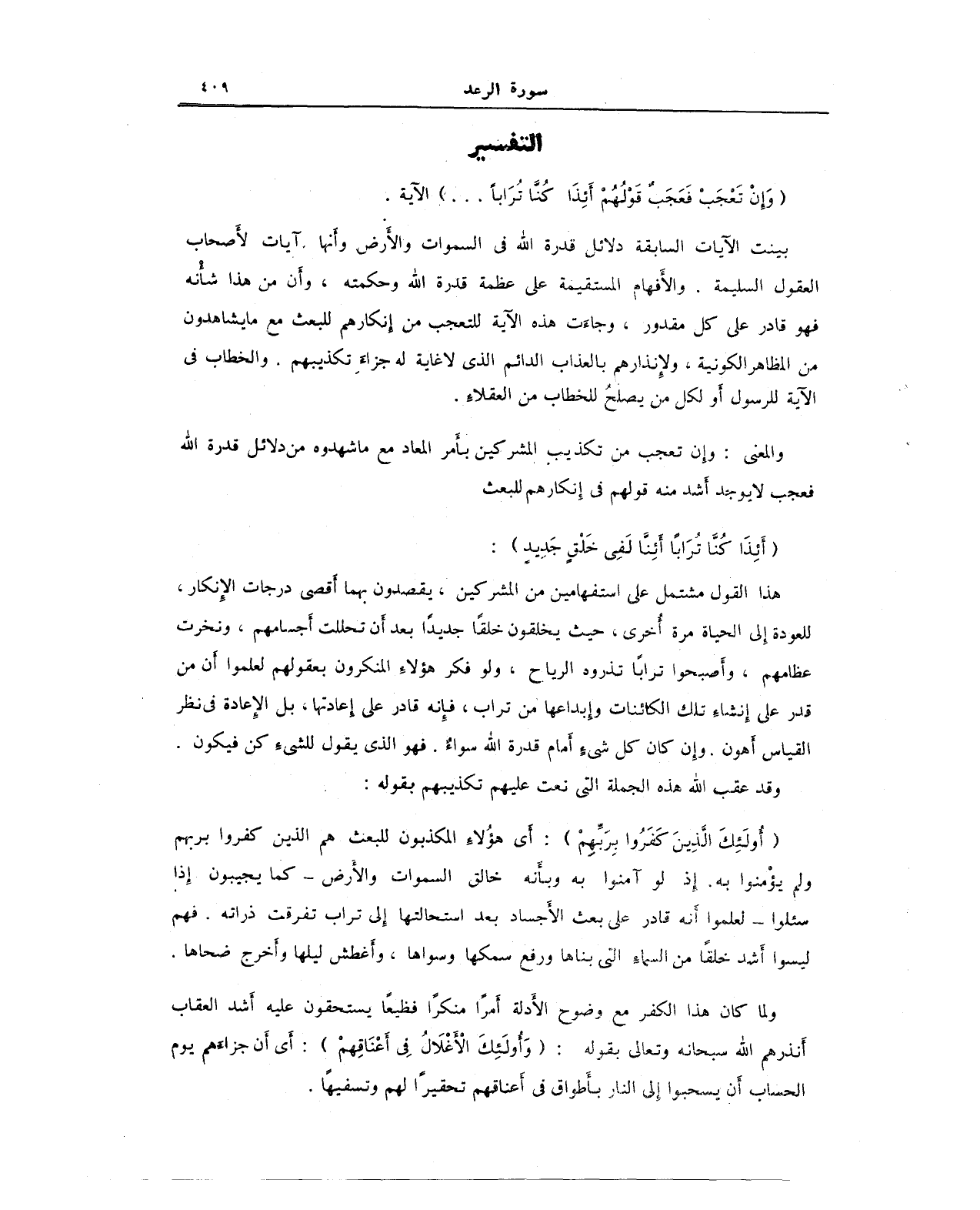 (أُولَئِكَ الَّذِينَ كَفَرُوا بِرَبِّهِمْ): أَي هؤُلاءِ المكذبون للبعث هم الذين كفروا بربهم ولم يؤْمنوا به. إِذ لو آمنوا به وبأَنه خالق السماوات والأَرض -كما يجيبون إِذا سئلوا- لعلموا أَنه قادر علي بعث الأَجساد بعد استحالتها إِلى تراب تفرقت ذراته. فهم ليسوا أَشد خلقًا من السماءِ التي بناها ورفع سمكها وسواها، وأَغطش ليلها وأَخرج ضحاها.