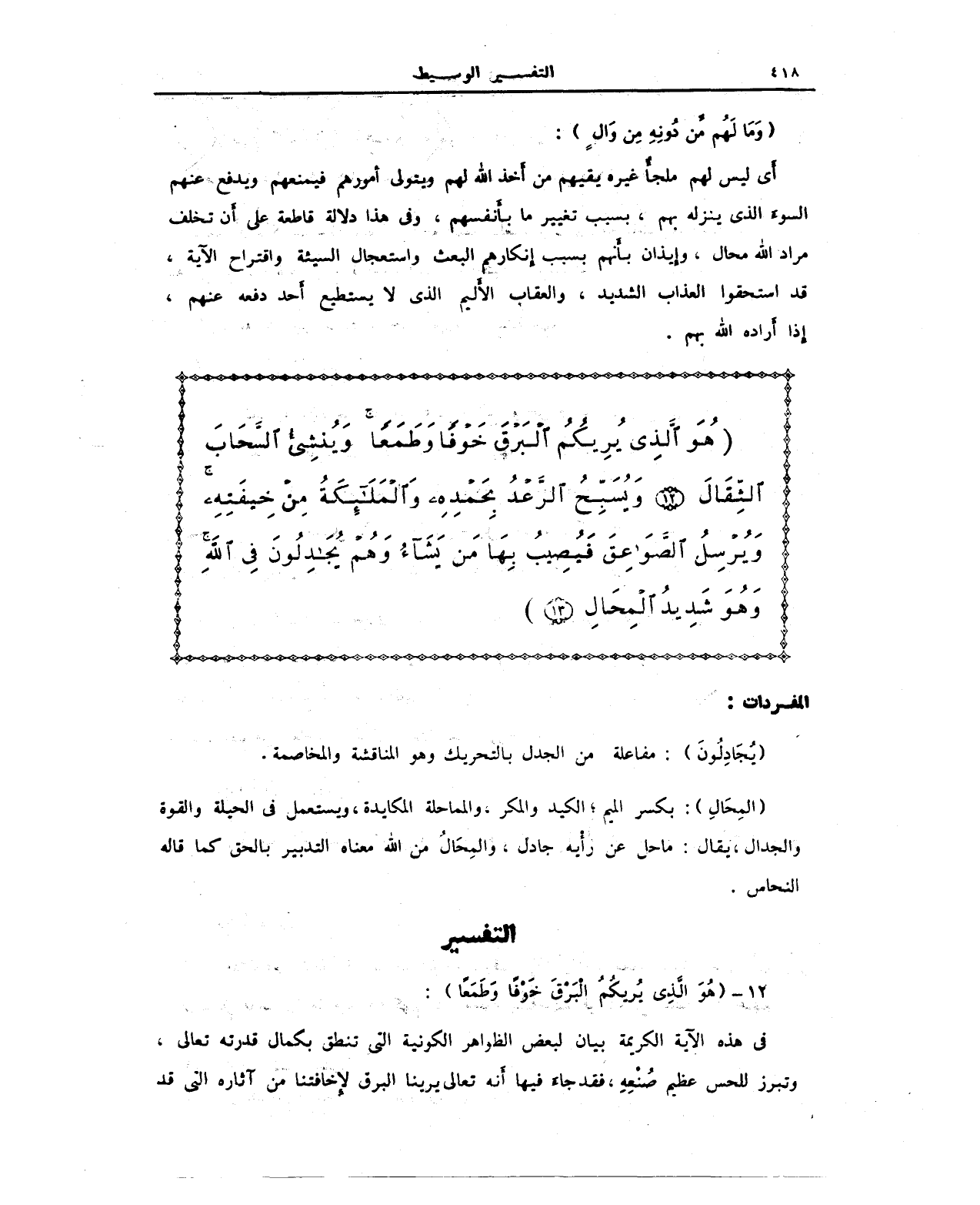 {هُوَ الَّذِي يُرِيكُمُ الْبَرْقَ خَوْفًا وَطَمَعًا وَيُنْشِئُ السَّحَابَ الثِّقَالَ (12) وَيُسَبِّحُ الرَّعْدُ بِحَمْدِهِ وَالْمَلَائِكَةُ مِنْ خِيفَتِهِ وَيُرْسِلُ الصَّوَاعِقَ فَيُصِيبُ بِهَا مَنْ يَشَاءُ وَهُمْ يُجَادِلُونَ فِي اللَّهِ وَهُوَ شَدِيدُ الْمِحَالِ (13)}.