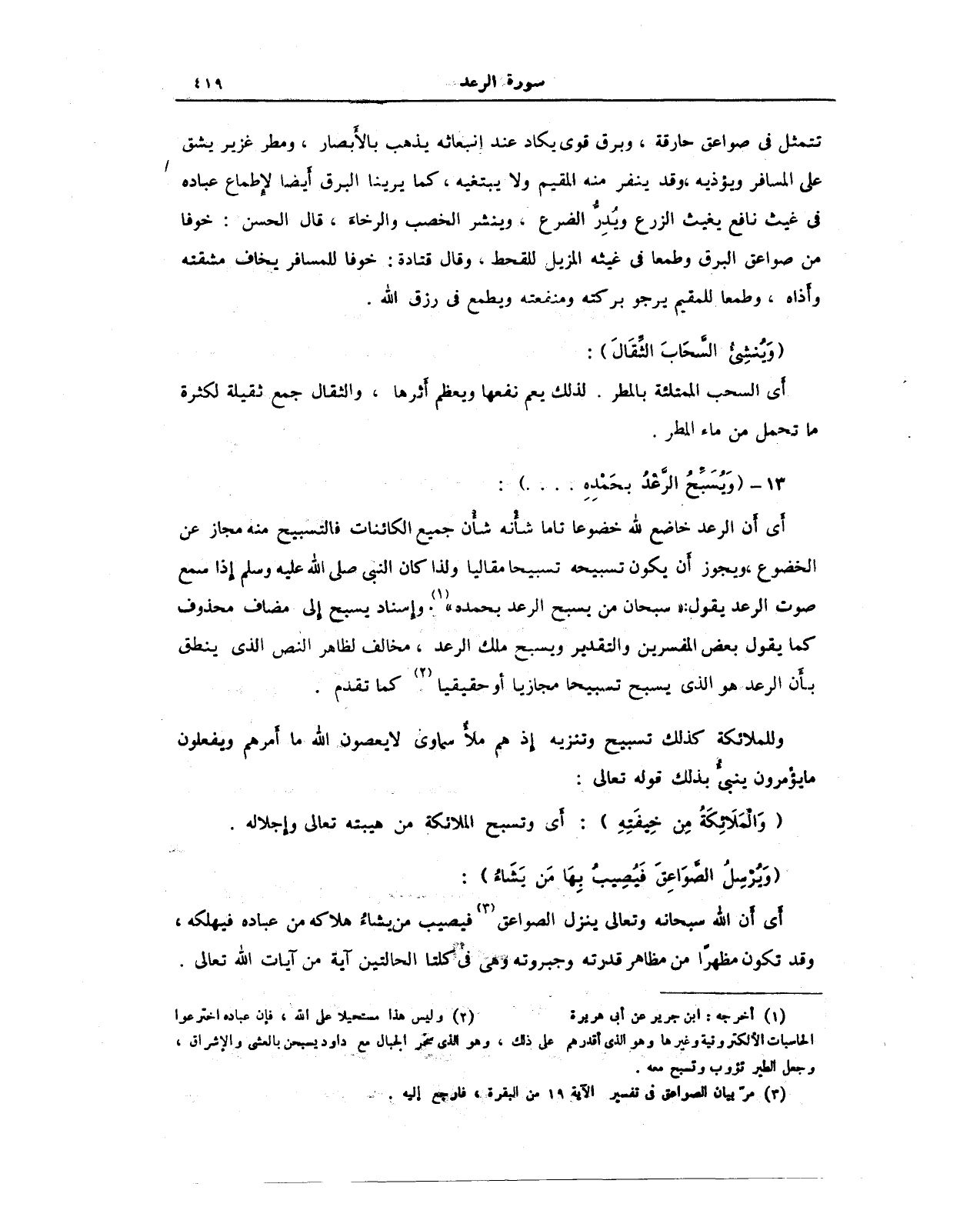 أَي أَن الرعد خاضع لله خضوعا تاما شأْنه شأْن جميع الكائنات فالتسبيح منه مجاز عن الخضوع، ويجوز أَن يكون تسبيحه تسبيحا مقاليا ولذا كان النبي صلى الله عليه وسلم إِذا سمع صوت الرعد يقول: "سبحان من يسبح الرعد بحمده" (¬1). وإِسناد يسبح إِلى مضاف محذوف كما يقول بعض المفسرين والتقدير ويسبح ملك الرعد، مخالف لظاهر النص الذي ينطق بأَن الرعد هو الذي يسبح تسبيحا مجازيا أَو حقيقيا (¬2) كما تقدِم.