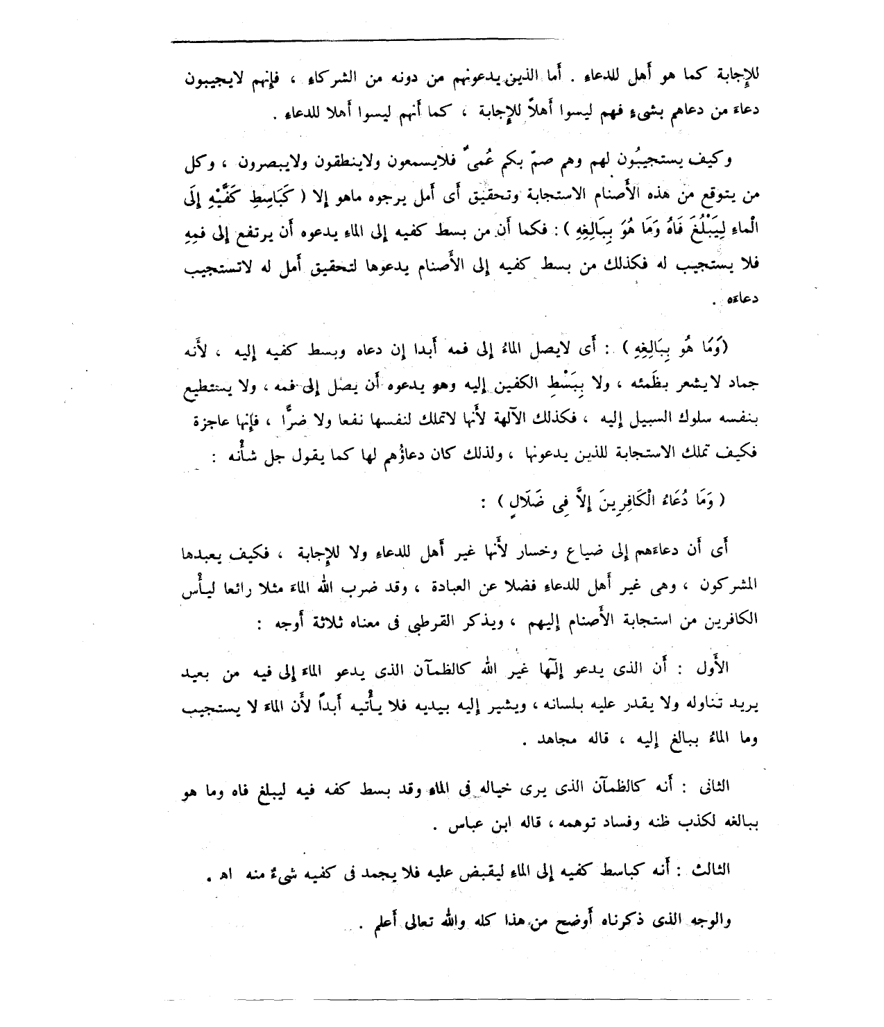 أَي أَن دعاءَهم إِلى ضياع وخسار لأَنها غير أَهل للدعاءِ ولا للإِجابة، فكيف يعبدها المشركون، وهى غير أَهل للدعاءَ فضلا عن العبادة، وقد ضرب الله الماءَ مثلا رائعا ليأْس الكافرين من استجابة الأَصنام إِليهم، ويذكر القرطبى في معناه ثلاثة أَوجه: