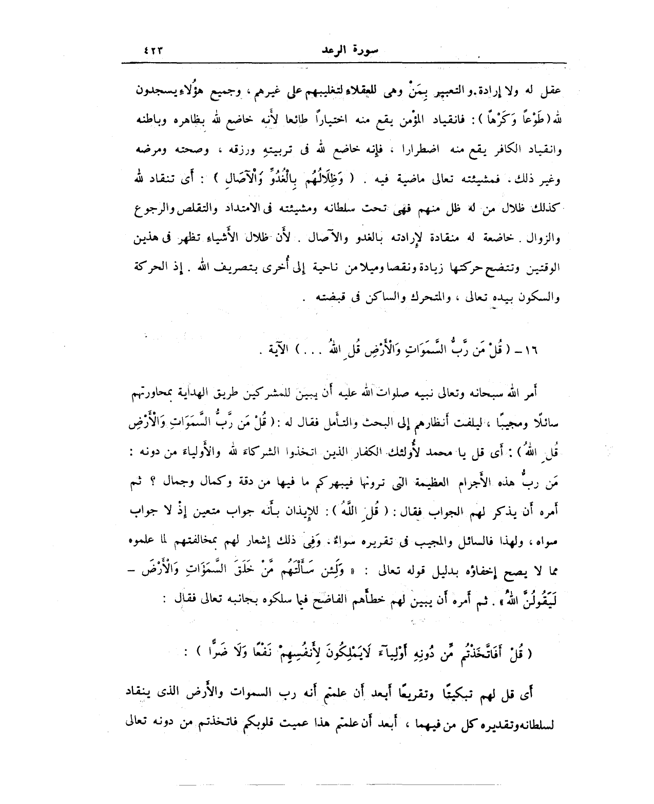 عقل له ولا إِرادة والتعبير بِمَنْ وهي للعقلاء لتغليبهم على غيرهم، وجميع هؤُلاءِ َيسجدون لله (طَوْعًا وَكَرْهًا): فانقياد المؤْمن يقع منه اختيارًا طائعا لأَنه خاضع لله بظاهره وباطنه وانقياد الكافر يقع منه اضطرارا، فإِنه خاضع لله في تربيتهِ ورزقه، وصحته ومرضه وغير ذلك. فمشيئته تعالى ماضية فيه. (وَظِلَالُهُم بِالْغُدُوِّ وَاْلآصَالِ): أَي تنقاد لله كذلك ظلال من له ظل منهم فهى تحت سلطانه ومشيئته في الامتداد والتقلص والرجوع والزوال. خاضعة له منقادة لإِرادته بالغدو والآصال. لأَن ظلال الأَشياءِ تظهر في هذين الوقتين وتتضح حركتها زيادة ونقصا وميلا من ناحية إِلى أَخرى بتصريف الله. إِذ الحركة والسكون بيده تعالى، والمتحرك والساكن في قبضته.