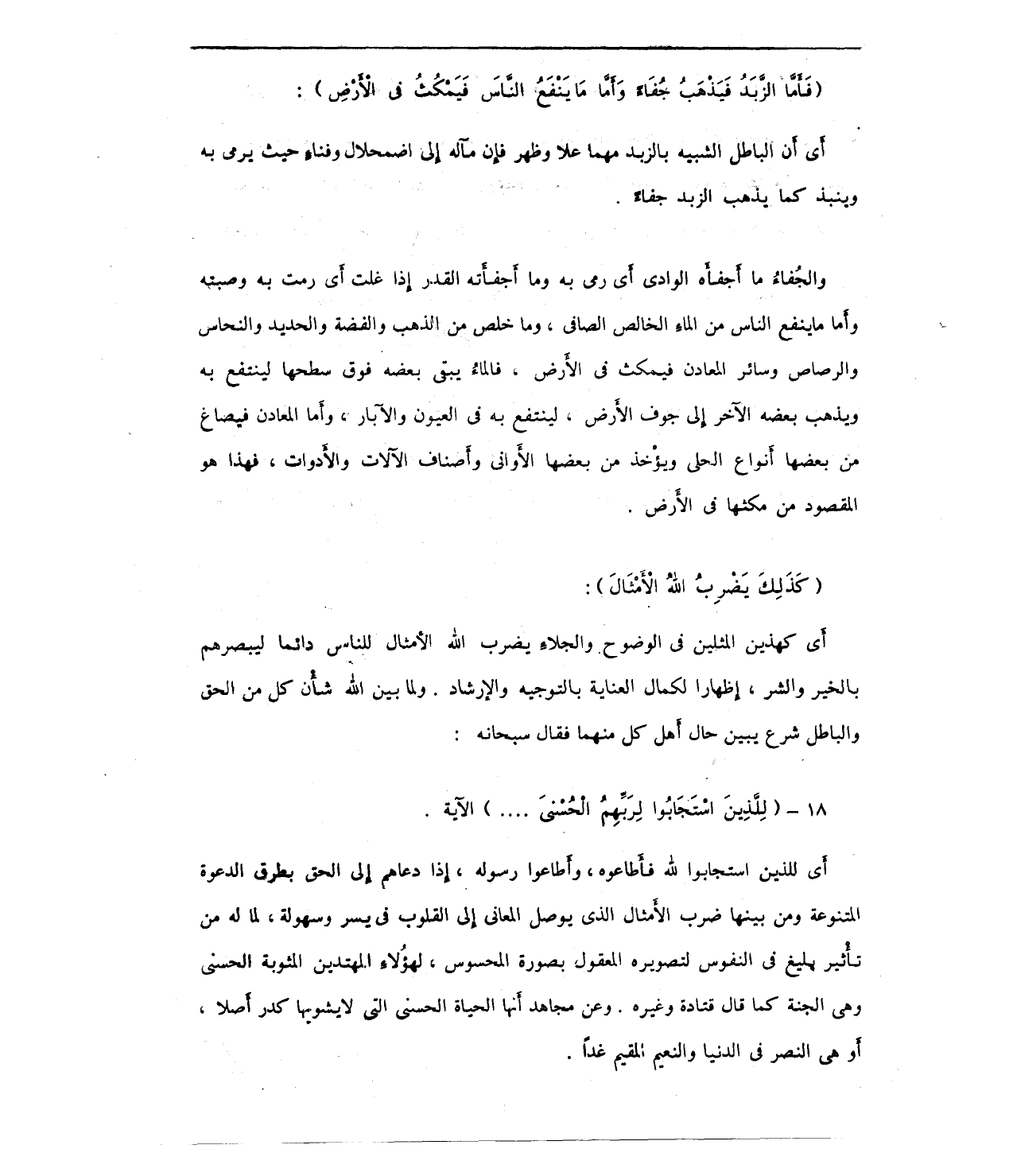 والجُفاءُ ما أَجفأَه الوادى أَي رمى به وما أَجفأَته القدر إِذا غلت أَي رمت به وصبته وأَما ما ينفع الناس من الماءِ الخالص الصافى، وما خلص من الذهب والفضة والحديد والنحاس والرصاص وسائر المعادن فيمكث في الأَرض، فالماءُ يبقى بعضه فوق سطحها لينتفع به ويذهب بعضه الآخر إِلى جوف الأَرض، لينتفع به في العيون والآبار، وأَما المعادن فيصاغ من بعضها أَنواع الحلى ويؤْخذ من بعضها الأَوانى وأَصناف الآلات والأَدوات، فهذا هو المقصود من مكثها في الأَرض.
