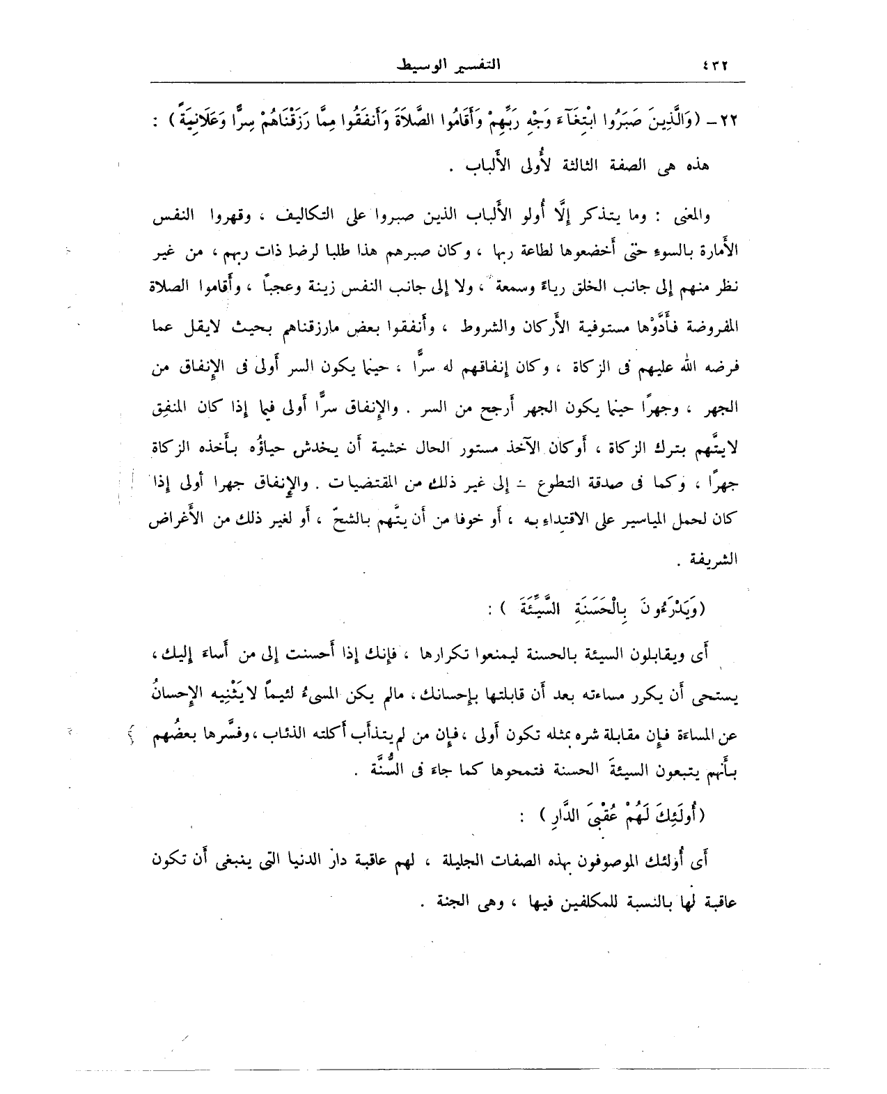 والمعنى: وما يتذكر إِلَّا أُولو الأَلباب الذين صبروا على التكاليف، وقهروا النفس الأَمارة بالسوءِ حتى أخضعوها لطاعة ربها، وكان صبرهم هذا طلبا لرضا ذات ربهم، من غير نظر منهم إِلى جانب الخلق رياءً وسمعة، ولا إِلى جانب النفس زينة وعجبًا، وأقاموا الصلاة المفروضة فأَدَّوْها مستوفية الأَركان والشروط، وأنفقوا بعض ما رزقناهم بحيث لا يقل عما فرضه الله عليهم في الزكاة، وكان إِنفاقهم له سرًّا. حينما يكون السر أَولى في الإِنفاق من الجهر، وجهرًا حينما يكون الجهر أَرجح من السر. والإِنفاق سرًّا أَولى فيما إِذا كان المنفِق لا يتَّهم بترك الزكاة، أَو كان الآخذ مستور الحال خشية أَن يخدش حياؤُه بأَخذه الزكاة جهرًا، وكما في صدقة التطوع -إِلى غير ذلك من المقتضيات. والإنفاق جهرا أولى إِذا كان لحمل المياسير على الاقتِداءِ به، أَو خوفا من أَن يتَّهم بالشحّ، أَو لغير ذلك من الأَغراض الشريفة.