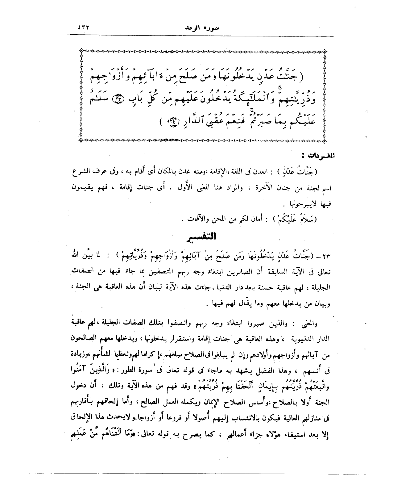 23 - (جَنَّاتُ عَدْنٍ يَدْخُلُونَهَا وَمَنْ صَلَحَ مِنْ آبَائِهِمْ وَأَزْوَاجِهِمْ وَذُرِّيَّاتِهِمْ): لما بيَّن الله تعالى في الآية السابقة أَن الصابرين ابتغاءَ وجه ربهم المتصفين بما جاءَ فيها من الصفات الجليلة، لهم عاقبة حسنة بعد دار الدنيا، جاءَت هذه الآية لبيان أَن هذه العاقبة هي الجنة، وبيان من يدخلها معهم وما يقال لهم فيها.