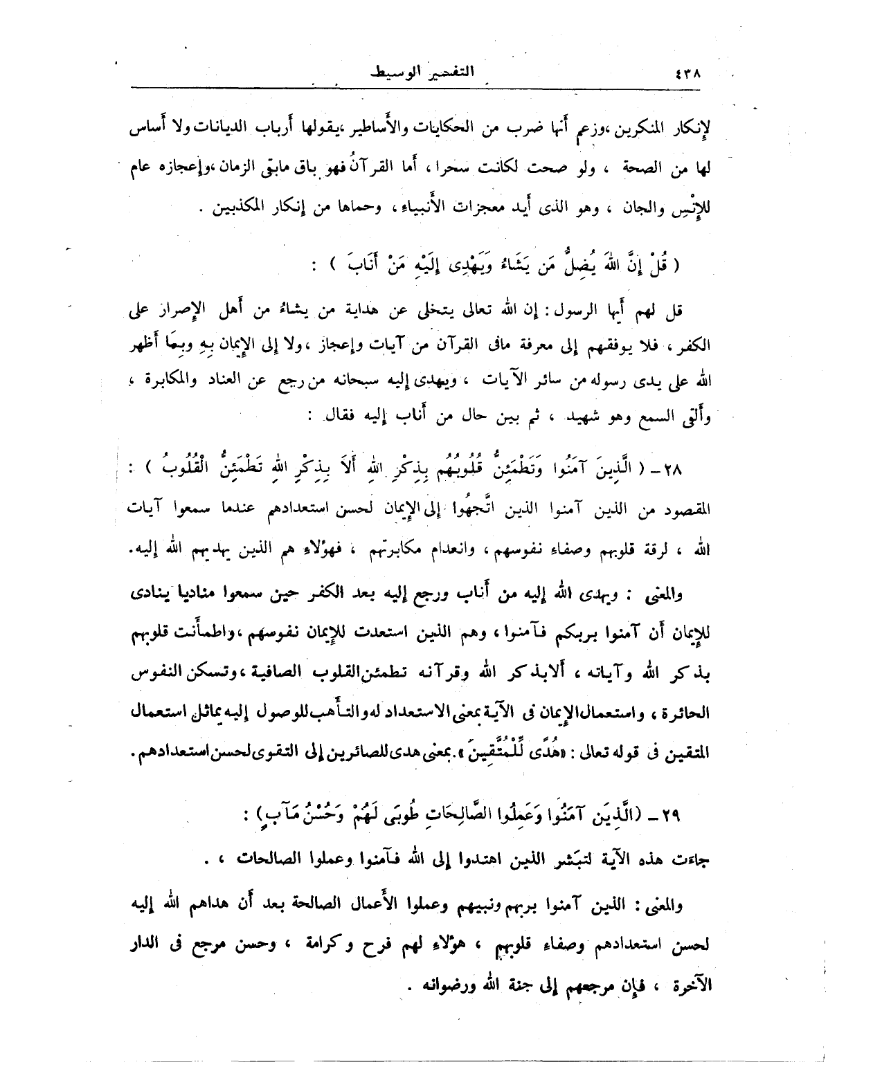 28 - (الَّذِينَ آمَنُوا وَتَطْمَئِنُّ قُلُوبُهُمْ بِذِكْرِ اللَّهِ أَلَا بِذِكْرِ اللَّهِ تَطْمَئِنُّ الْقُلُوبُ): المقصود من الذين آمنوا الذين اتَّجهُوا إِلى الإِيمان لحسن استعدادهم عندما سمعوا آيات الله، لرقة قلوبهم وصفاءِ نفوسهم، وانعدام مكابرتهم، فهؤلاءِ هم الذين يهديهم الله إِليه.