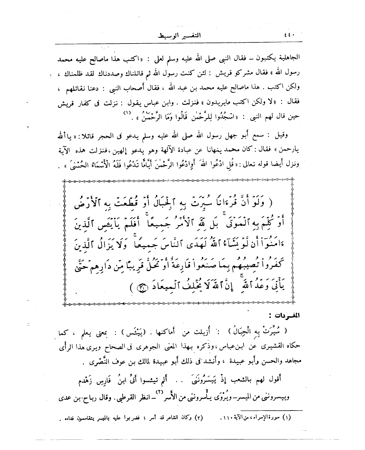 (سُيِّرَتْ بِهِ الْجِبَالُ): أُزيلت من أَماكنها. (يَيْئَس): بمعنى يعلم، كما حكاه القشيرى عن ابن عباس، وذكره بهذا المعنى الجوهرى في الصحاح ويرى هذا الرأْى مجاهد والحسن وأَبو عبيدة، وأَنشد في ذلك أَبو عبيدة لمالك بن عوف النَّصْرى.