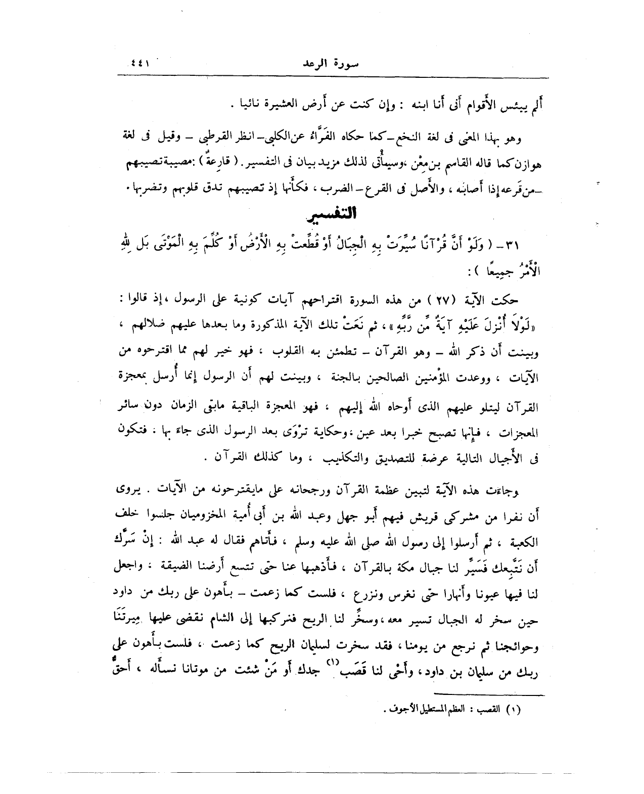 وجاءَت هذه الآية لتبين عظمة القرآن ورجحانه على ما يقترحونه من الآيات. يروى أَن نفرا من مشركى قريش فيهم أَبو جهل وعبد الله بن أَبي أَمية المخزوميان جلسوا خلف الكعبة، ثم أرسلوا إِلى رسول الله صلى الله عليه وسلم، فأَتاهم فقال له عبد الله: إِنْ سَرَّك أَن نَتَّبعِك فَسَيِّر لنا جبال مكة بالقرآن، فأَذهبها عنا حتى تتسع أَرضنا الضيقة، واجعل لنا فيها عيونا وأَنهارا حتى نغرس ونزرع، فلست كما زعمت -بأَهون على ربك من داود حين سخر له الجبال تسير معه، وسخِّر لنا الريح فنركبها إِلى الشام نقضى عليها مِيرتَنَا وحوائجنا ثم نرجع من يومنا، فقد سخرت لسليمان الريح كما زعمت، فلست بأَهون على ربك من سليمان بن داود، وأَحْي لنا قَصَب (¬1) جدك أَو مَنْ شئت من موتانا نسأَله، أَحقٌّ