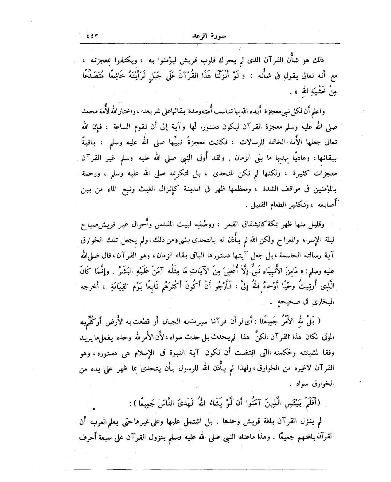 (بَلْ لِلَّهِ الْأَمْرُ جَمِيعًا): أَي لو أَن قرآنا سيرت به الجبال أَو قطعت به الأَرض أَو كُلم به الوتى لكان هذا القرآن، لكنَّ هذا لم يحدث بل حدث سواه، لأَن الأَمر لله وحده يفعل ما يريد وفقا لمشيئته وحكمته، التي اقتضت أَن تكون آية النبوة في الإِسلام هي دستوره، وهو القرآن لا غيره من الخوارق، ولهذا لم يأْذن الله للرسول بأَن يتحدى بما ظهر على يده من الخوارق سواه.