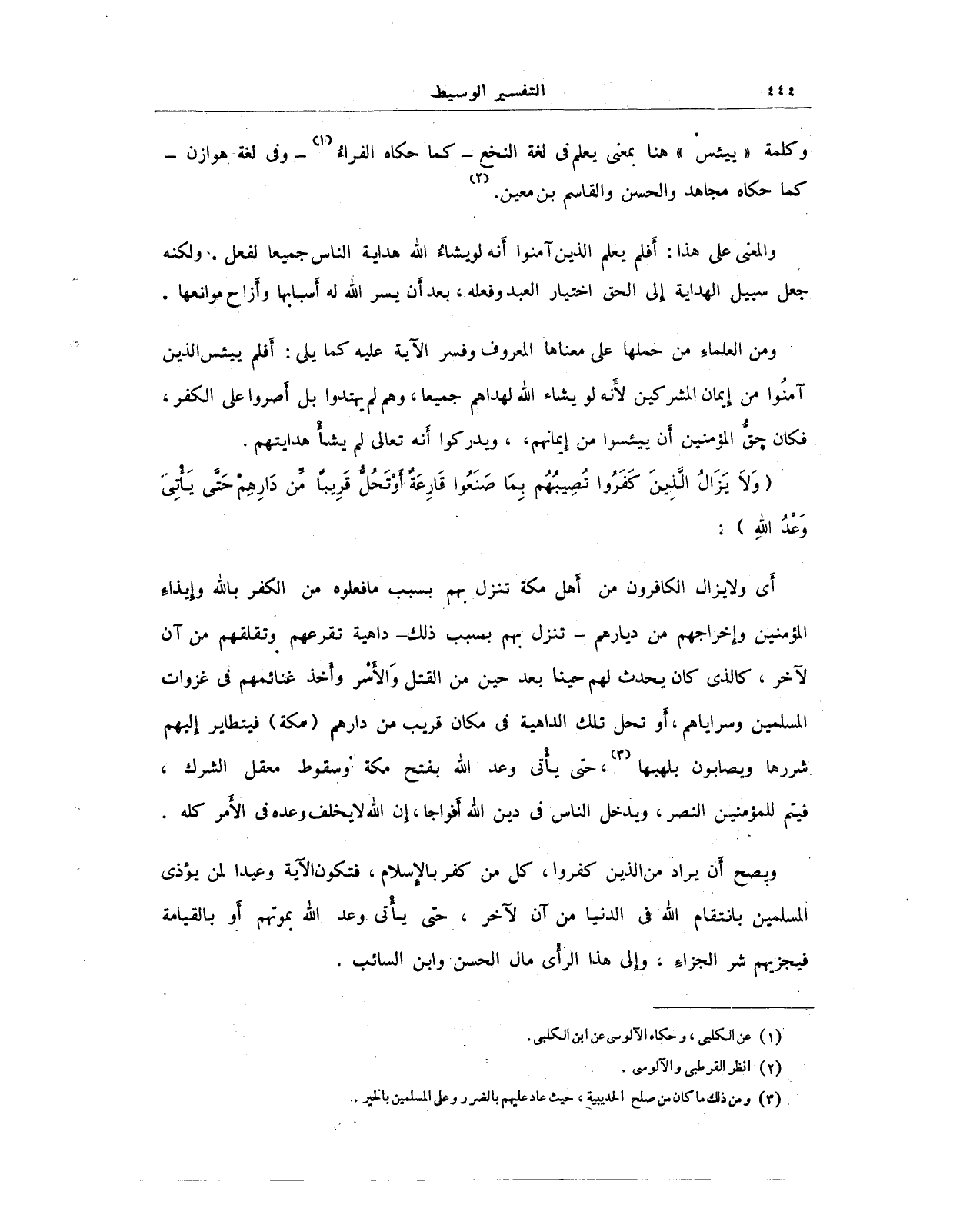 والمعنى على هذا: أَفلم يعلم الذين آمنوا أَنه لو يشاءُ الله هداية الناس جميعًا لفعل. ولكنه جعل سبيل الهداية إِلى الحق اختيار العبد وفعله، بعد أَن يسر الله له أَسبابها وأَزاح موانعها.