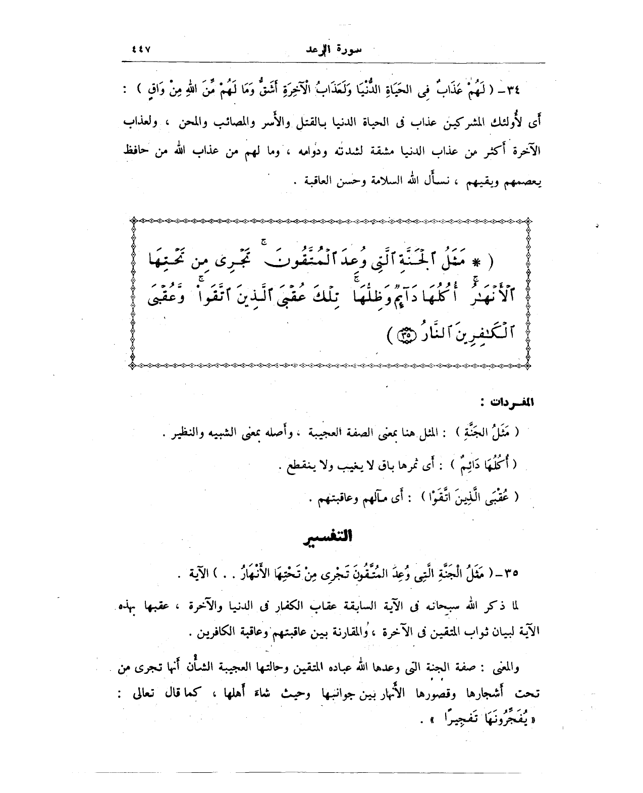 {مَثَلُ الْجَنَّةِ الَّتِي وُعِدَ الْمُتَّقُونَ تَجْرِي مِنْ تَحْتِهَا الْأَنْهَارُ أُكُلُهَا دَائِمٌ وَظِلُّهَا تِلْكَ عُقْبَى الَّذِينَ اتَّقَوْا وَعُقْبَى الْكَافِرِينَ النَّارُ (35)}