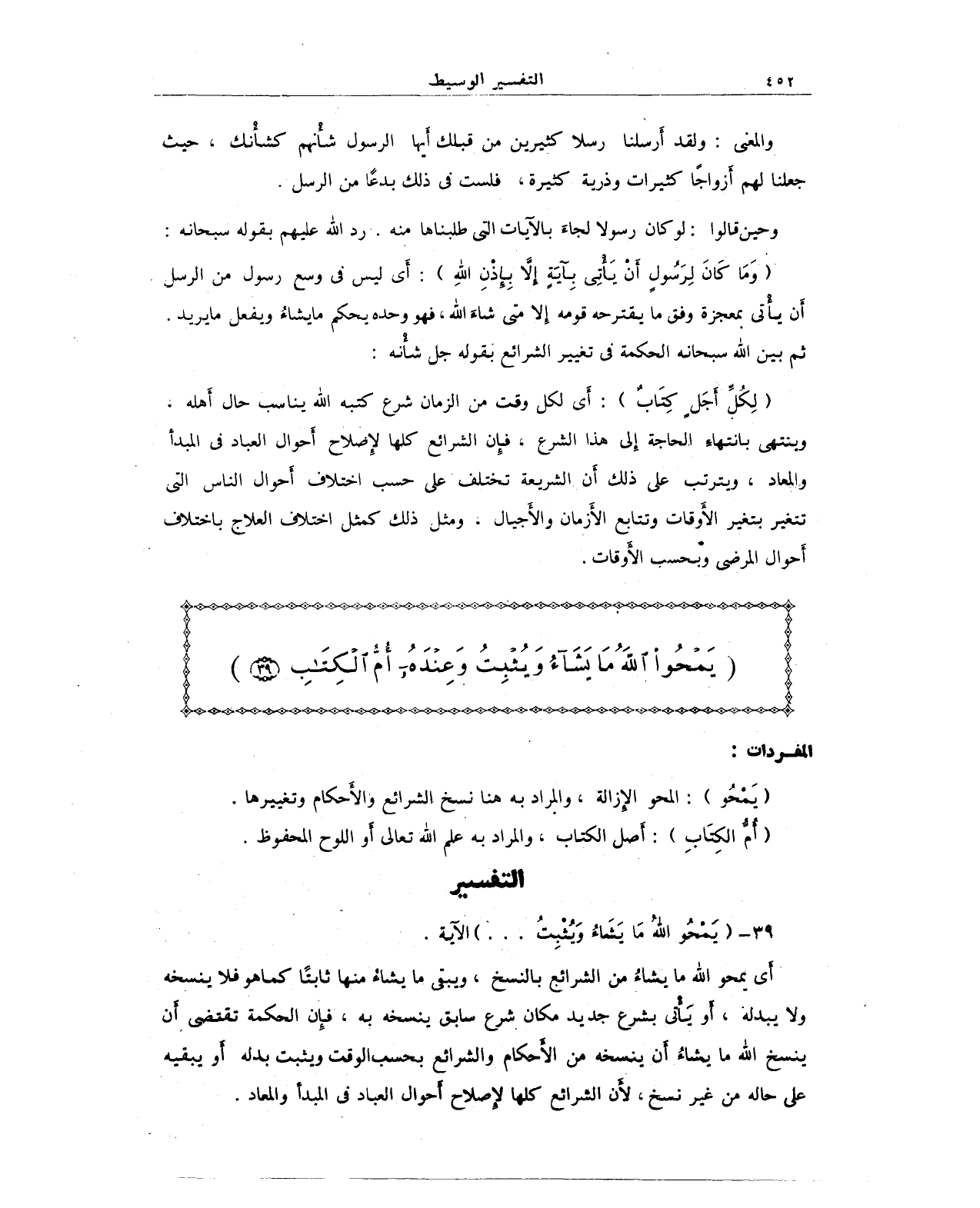 أَي يمحو الله ما يشاءُ من الشرائع بالنسخ، ويبقى ما يشاءُ منها ثابتًا كما هو فلا ينسخه ولا يبدله، أَو يَأْتى بشرع جديد مكان شرع سابق ينسخه به، فإِن الحكمة تقتضى أَن ينسخ الله ما يشاءُ أَن ينسخه من الأَحكام والشرائع بحسب الوقت ويثبت بدله أَو يبقيه على حاله من غير نسخ، لأَن الشرائع كلها لأَصلاح أَحوال العباد في المبدأ والمعاد.