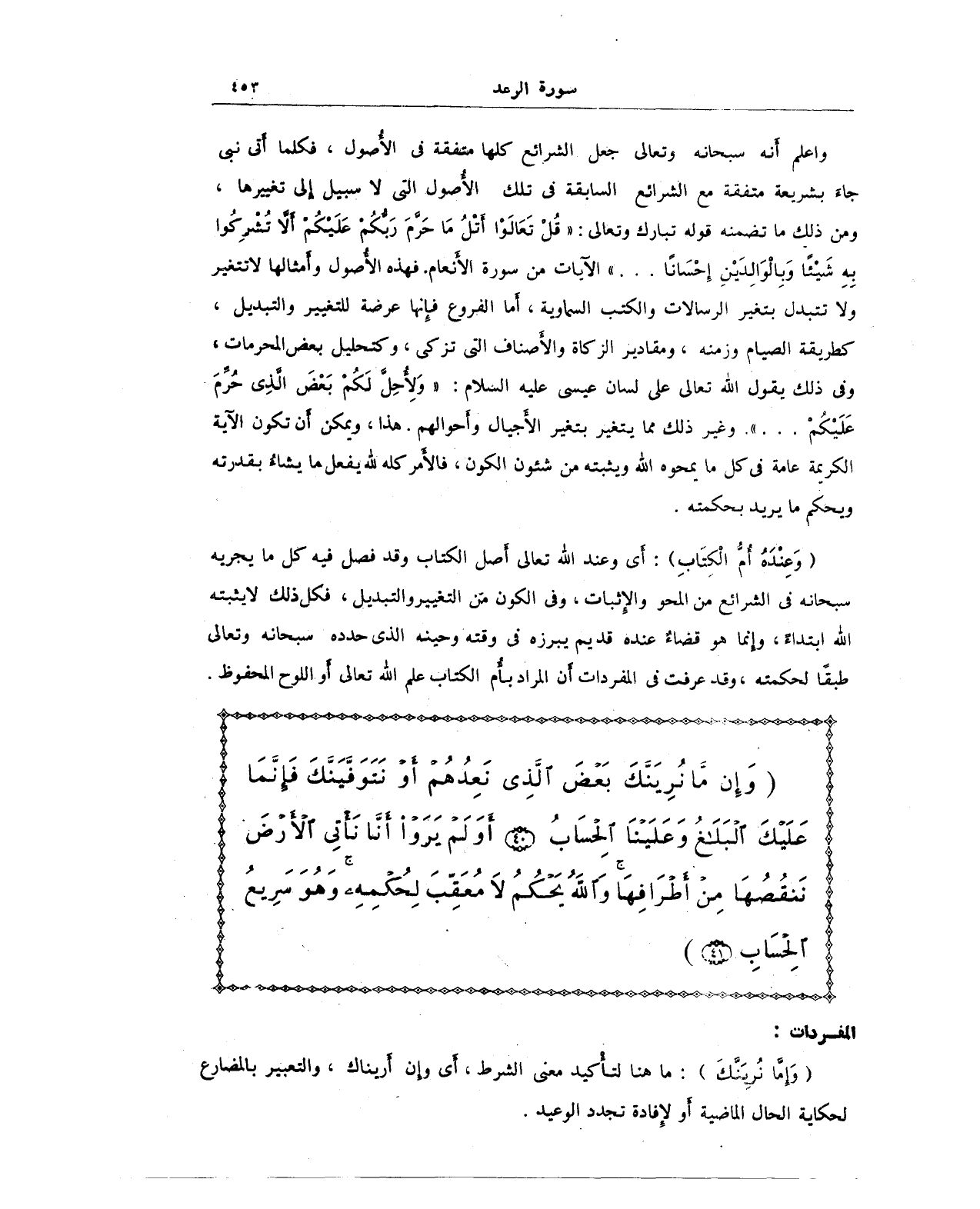 واعلم أَنه سبحانه وتعالى جعل الشرائع كلها فتفقة في الأَصول، فكلما أَتى نبي جاءَ بشريعة متفقة مع الشرائع السابقة في تلك الأَصول التي لا سبيل إِلى تغييرها، ومن ذلك ما تضمنه قوله تبارك وتعالى: {قُلْ تَعَالَوْا أَتْلُ مَا حَرَّمَ رَبُّكُمْ عَلَيْكُمْ أَلَّا تُشْرِكُوا بِهِ شَيْئًا وَبِالْوَالِدَيْنِ إِحْسَانًا ... ) الآيات من سورة الأَنعام. فهذه الأَصول وأَمثالها لا تتغير ولا تتبدل بتغير الرسالات والكتب السماوية، أَما الفروع فإِنها عرضة للتغيير والتبديل، كطريقة الصيام وزمنه، ومقادير الزكاة والأَصناف التي تزكى، وكتحليل بعض المحرمات، وفي ذلك يقول الله تعالى على لسان عيسى عليه السلام: "وَلِأُحِلَّ لَكُمْ بَعْضَ الَّذِي حُرِّمَ عَلَيْكُمْ ... ". وغير ذلك مما يتغير بتغير الأَجيال وأَحوالهم. هذا، ويمكن أَن تكون الآية الكريمة عامة في كل ما يمحوه الله ويثبته من شئون الكون، فالأمر كله لله يفعل ما يشاءُ بقدرته ويحكم ما يريد بحكمته.