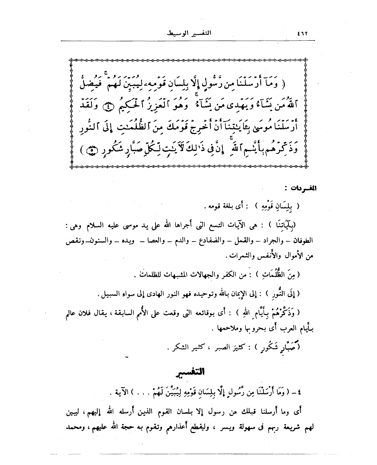 {وَمَا أَرْسَلْنَا مِنْ رَسُولٍ إِلَّا بِلِسَانِ قَوْمِهِ لِيُبَيِّنَ لَهُمْ فَيُضِلُّ اللَّهُ مَنْ يَشَاءُ وَيَهْدِي مَنْ يَشَاءُ وَهُوَ الْعَزِيزُ الْحَكِيمُ (4) وَلَقَدْ أَرْسَلْنَا مُوسَى بِآيَاتِنَا أَنْ أَخْرِجْ قَوْمَكَ مِنَ الظُّلُمَاتِ إِلَى النُّورِ وَذَكِّرْهُمْ بِأَيَّامِ اللَّهِ إِنَّ فِي ذَلِكَ لَآيَاتٍ لِكُلِّ صَبَّارٍ شَكُورٍ (5)}