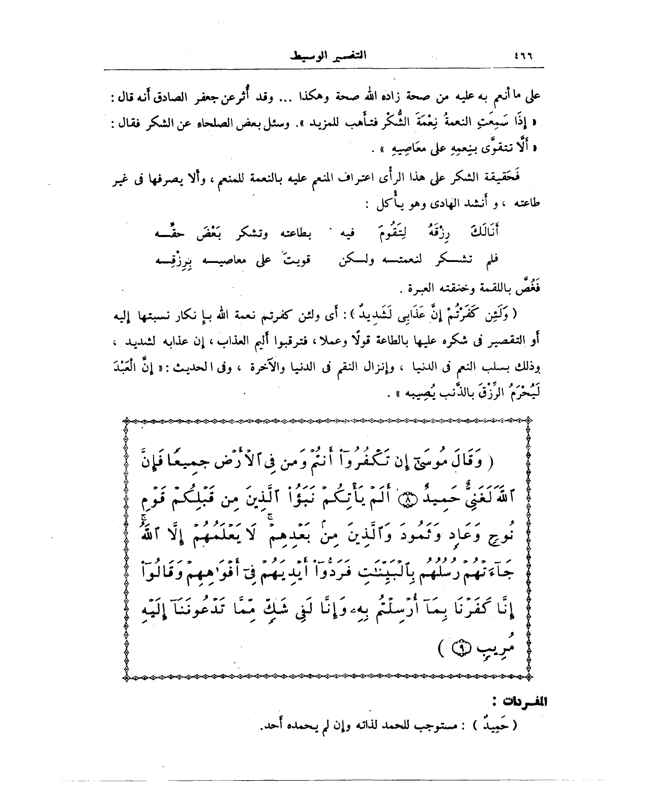 (وَقَالَ مُوسَى إِنْ تَكْفُرُوا أَنْتُمْ وَمَنْ فِي الْأَرْضِ جَمِيعًا فَإِنَّ اللَّهَ لَغَنِيٌّ حَمِيدٌ (8) أَلَمْ يَأْتِكُمْ نَبَأُ الَّذِينَ مِنْ قَبْلِكُمْ قَوْمِ نُوحٍ وَعَادٍ وَثَمُودَ وَالَّذِينَ مِنْ بَعْدِهِمْ لَا يَعْلَمُهُمْ إِلَّا اللَّهُ جَاءَتْهُمْ رُسُلُهُمْ بِالْبَيِّنَاتِ فَرَدُّوا أَيْدِيَهُمْ فِي أَفْوَاهِهِمْ وَقَالُوا إِنَّا كَفَرْنَا بِمَا أُرْسِلْتُمْ بِهِ وَإِنَّا لَفِي شَكٍّ مِمَّا تَدْعُونَنَا إِلَيْهِ مُرِيبٍ (9))