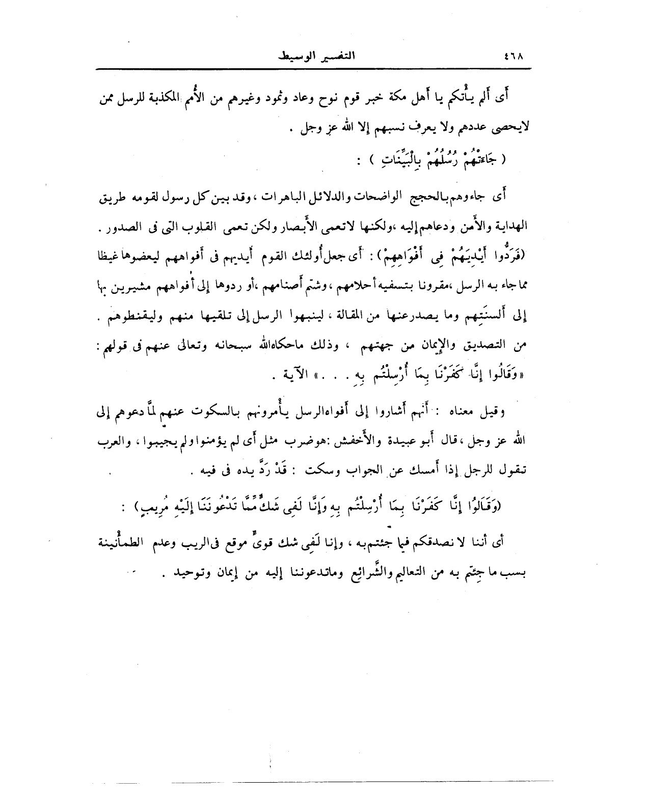 (فَرَدُّوا أَيْدِيَهُمْ فِي أَفْوَاهِهِمْ): أَي جعل أُولئك القوم أَيديهم في أَفواههم ليعضوها غيظا مما جاء به الرسل، مقرونا بتسفيه أحلامهم، وشتم أَصنامهما، أو ردوها إِلى أَفواههم مشيرين بها إِلى أَلسنَتِهم وما يصدر عنها من المقالة، لينبهوا الرسل إلى تلقيها منهم وليقنطوهم. من التصديق والإِيمان عن جهتهم، وذلك ما حكماه الله سبحانه وتعالى عنهم في قولهم: "وَقَالُوا إِنَّا كَفَرْنَا بِمَا أُرْسِلْتُمْ بِهِ ... " الآية.