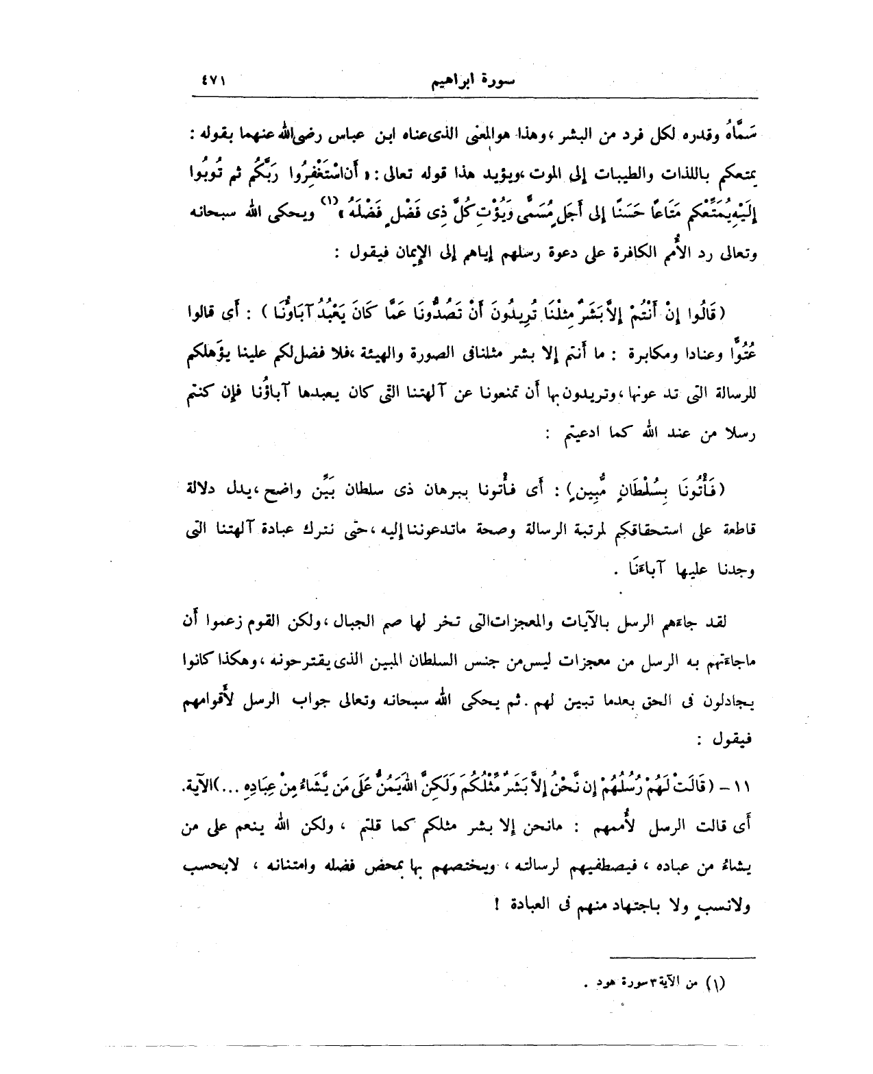 11 - (قَالَتْ لَهُمْ رُسُلُهُمْ إِنْ نَحْنُ إِلَّا بَشَرٌ مِثْلُكُمْ وَلَكِنَّ اللَّهَ يَمُنُّ عَلَى مَنْ يَشَاءُ مِنْ عِبَادِهِ ... ) الآية. أَي قالت الرسل لأُممهم: ما نحن إِلا بشر مثلكم كما قلتم، ولكن الله ينعم على من يشاءُ من عباده، فيصطفيهم لرسالته، يختصهم بها بمحض فضله وامتنانه، لا بحسب ولا نسبٍ ولا باجتهاد منهم في العبادة!