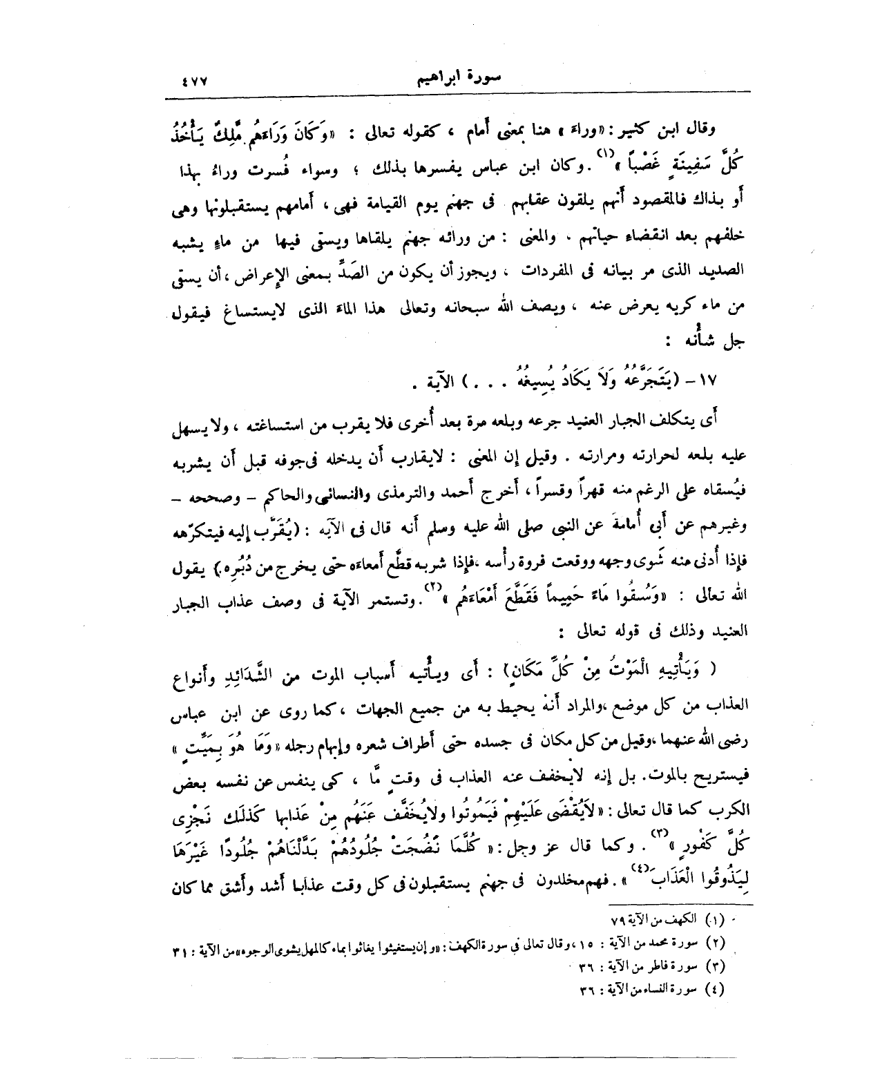 وقال ابن كثير: "وراءَ" هنا بمعنى أَمام، كقوله تعالى: "وَكَانَ وَرَاءَهُمْ مَلِكٌ يَأْخُذُ كُلَّ سَفِينَةٍ غَصْبًا" (¬1). وكان ابن عباس يفسرها بذلك؛ وسواء فُسرت وراءُ بهذا أَو بذاك فالمقصود أَنهم يلقون عقابهم في جهنم يوم القيامة فهي، أَمامهم يستقبلونها وهى خلفهم بعد انقضاءِ حياتهم، والمعنى: من ورانه جهنم يلقاها ويسقى فيها من ماءٍ يشبه الصديد الذي مر بيانه في المفردات، ويجوز أَن يكون من الصَدِّ بمعنى الإِعراض، أَن يسقى من ماء كريه يعرض عنه، ويصف الله سبحانه وتعالى هذا الماء الذي لا يستساغ فيقول جل شأْنه: