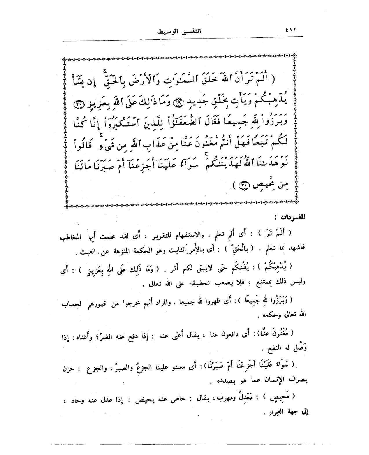 {أَلَمْ تَرَ أَنَّ اللَّهَ خَلَقَ السَّمَاوَاتِ وَالْأَرْضَ بِالْحَقِّ إِنْ يَشَأْ يُذْهِبْكُمْ وَيَأْتِ بِخَلْقٍ جَدِيدٍ (19) وَمَا ذَلِكَ عَلَى اللَّهِ بِعَزِيزٍ (20) وَبَرَزُوا لِلَّهِ جَمِيعًا فَقَالَ الضُّعَفَاءُ لِلَّذِينَ اسْتَكْبَرُوا إِنَّا كُنَّا لَكُمْ تَبَعًا فَهَلْ أَنْتُمْ مُغْنُونَ عَنَّا مِنْ عَذَابِ اللَّهِ مِنْ شَيْءٍ قَالُوا لَوْ هَدَانَا اللَّهُ لَهَدَيْنَاكُمْ سَوَاءٌ عَلَيْنَا أَجَزِعْنَا أَمْ صَبَرْنَا مَا لَنَا مِنْ مَحِيصٍ (21)}