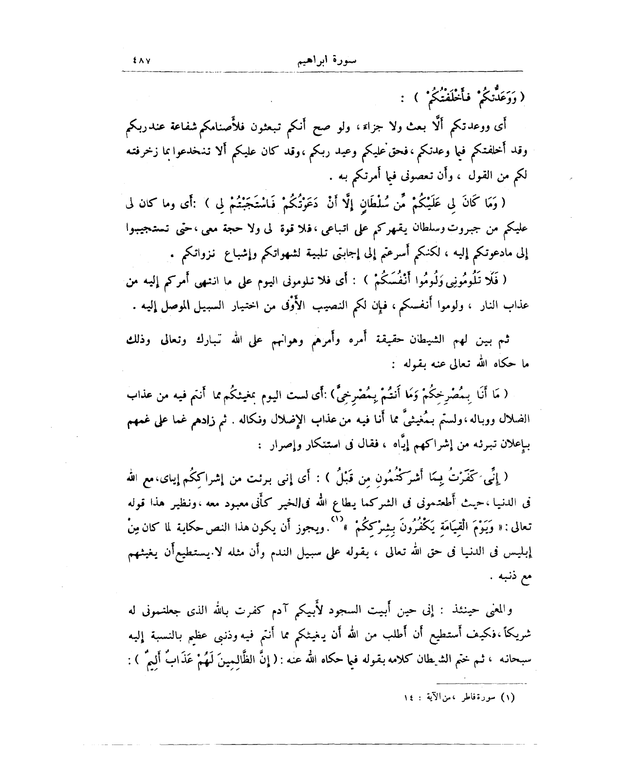 والمعنى حينئذ: إنى حين أبيت السجود لأَبيكم آدم كفرت بالله الذي جعلتمونى له شريكًا، فكيف أَستطيع أَن أطلب من الله أَن يغيثكم مما أَنتم فيه وذنبى عظيم بالنسبة إليه سبحانه، ثم ختم الشيطان كلامه بقوله فيما حكاه الله عنه: (أنَّ الظَّالِمِينَ لهمْ عَذَابٌ أَلِيمٌ):
