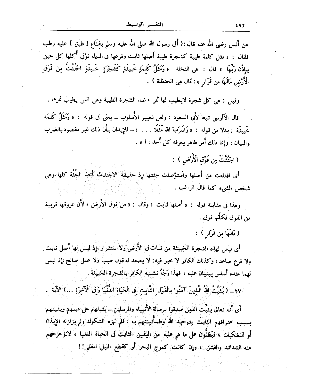 عن أَنس رضي الله عنه قال: (أَتى رسول الله صلى الله عليه وسلم بقِنَاع (طبق) عليه رطب فقال: "مثل كلمة طيبة كشجرة طيبة أَصلها ثابت وفرعها في السماء تؤتى أُكلها كل حين بإِذن رَبِّهَا"، قال: هي النخلة "وَمَثَلُ كَلِمَةٍ خَبِيثَةٍ كَشَجَرَةٍ خَبِيثَةٍ اجْتُثَّتْ مِنْ فَوْقِ الْأَرْضِ مَا لَهَا مِنْ قَرَارٍ": قال هي الحنظلة).