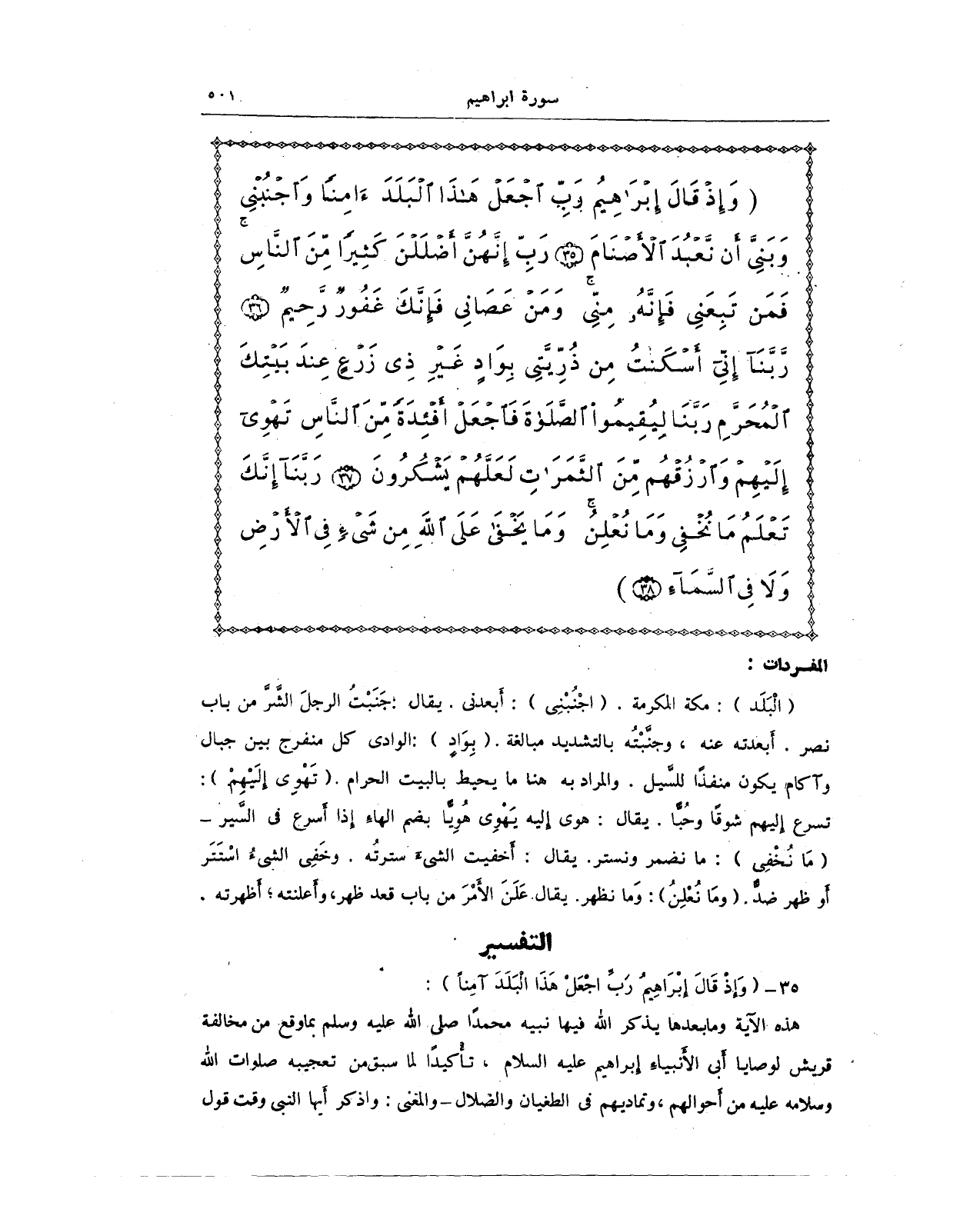 {وَإِذْ قَالَ إِبْرَاهِيمُ رَبِّ اجْعَلْ هَذَا الْبَلَدَ آمِنًا وَاجْنُبْنِي وَبَنِيَّ أَنْ نَعْبُدَ الْأَصْنَامَ (35) رَبِّ إِنَّهُنَّ أَضْلَلْنَ كَثِيرًا مِنَ النَّاسِ فَمَنْ تَبِعَنِي فَإِنَّهُ مِنِّي وَمَنْ عَصَانِي فَإِنَّكَ غَفُورٌ رَحِيمٌ (36) رَبَّنَا إِنِّي أَسْكَنْتُ مِنْ ذُرِّيَّتِي بِوَادٍ غَيْرِ ذِي زَرْعٍ عِنْدَ بَيْتِكَ الْمُحَرَّمِ رَبَّنَا لِيُقِيمُوا الصَّلَاةَ فَاجْعَلْ أَفْئِدَةً مِنَ النَّاسِ تَهْوِي إِلَيْهِمْ وَارْزُقْهُمْ مِنَ الثَّمَرَاتِ لَعَلَّهُمْ يَشْكُرُونَ (37) رَبَّنَا إِنَّكَ تَعْلَمُ مَا نُخْفِي وَمَا نُعْلِنُ وَمَا يَخْفَى عَلَى اللَّهِ مِنْ شَيْءٍ فِي الْأَرْضِ وَلَا فِي السَّمَاءِ (38)}