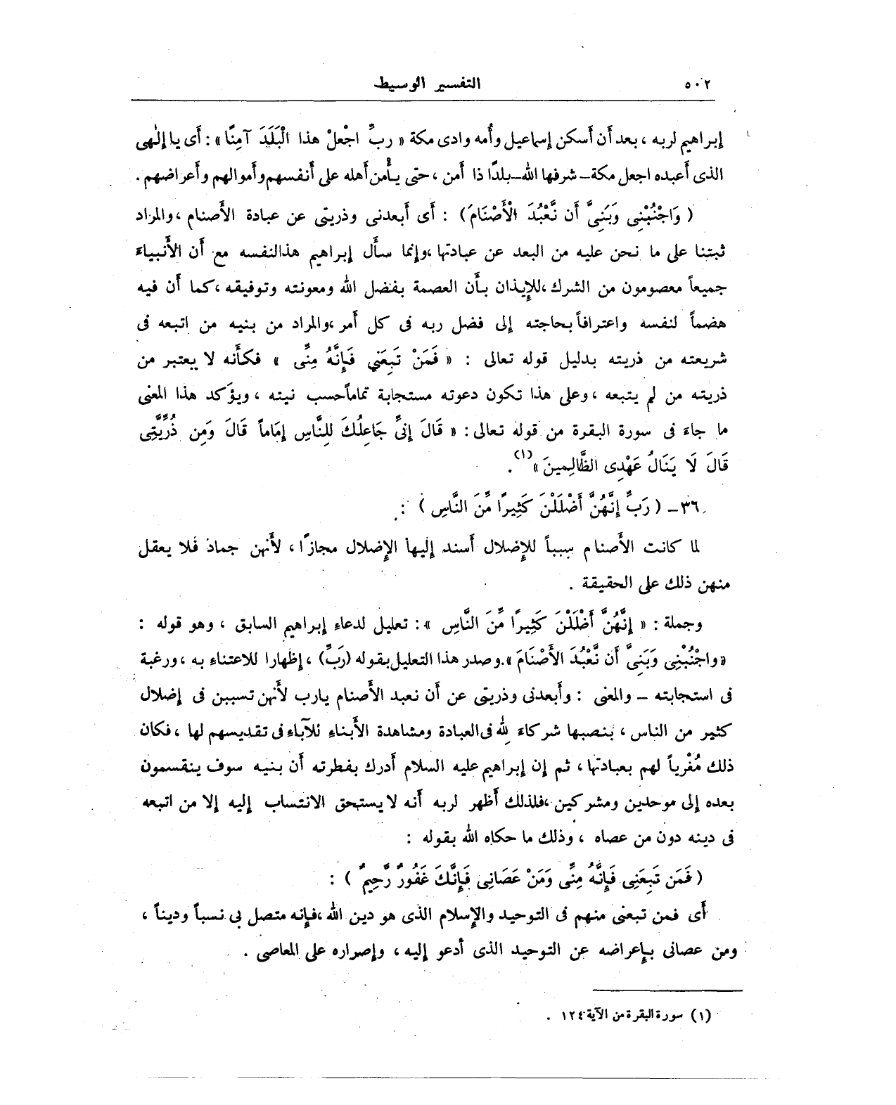 وجملة: {إِنَّهُنَّ أَضْلَلْنَ كَثِيرًا مِنَ النَّاسِ}: تعليل لدعاءِ إبراهيم السابق، وهو قوله: {وَاجْنُبْنِي وَبَنِيَّ أَنْ نَعْبُدَ الْأَصْنَامَ}. وصدر هذا التعليل بقوله (رَبِّ)، إظهارا للاعتناء به، ورغبة فى استجابته -والمعنى: وأَبعدني وذريتي عن أَن نعبد الأصنام يا رب لأنهن تسببن فى إِضلال كثير من الناس، بنصبها شركاءَ لِله فى العبادة ومشاهدة الأبناء للآباءَ في تقديسهم لها، فكان ذلك مُغْريًا لهم بعبادتها، ثم إِن إِبراهيم عليه السلام أدرك بفطرته أَن بنيه سوف ينقسمون بعده إلى موحدين ومشركين، فلذلك أَظهر لربه أنه لا يستحق الانتساب إِليه إلا من اتبعه فى دينه دون من عصاه، وذلك ما حكاه الله بقوله: