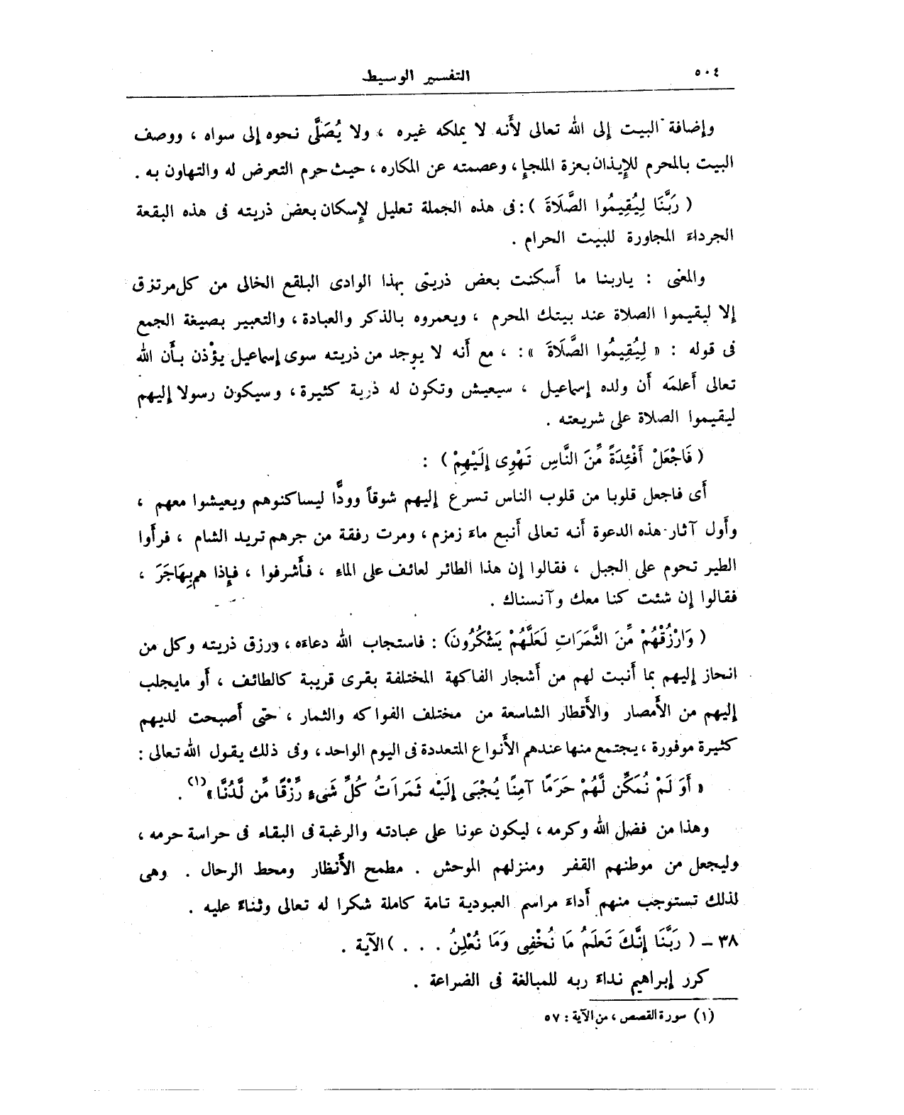 والمعنى: يا ربنا ما أَسكنت بعض ذريتي بهذا الوادي البلقع الخالي من كل مرتزق إلا ليقيموا الصلاة عند بيتك المحرم، ويعمروه بالذكر والعبادة، والتعبير بصيغة الجمع فى قوله: {لِيُقِيمُوا الصَّلَاةَ}: مع أَنه لا يوجد من ذريته سوى إسماعيل يؤذن بأن الله تعالى أَعلمَه أن ولده إسماعيل، سيعيش وتكون له ذرية كثيرة، وسيكون رسولا إليهم ليقيموا الصلاة على شريعته.