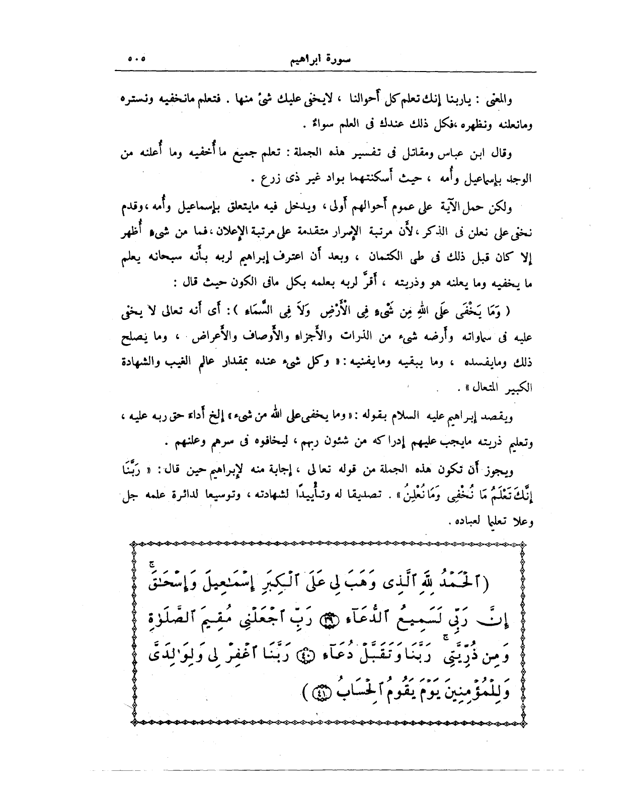 {الْحَمْدُ لِلَّهِ الَّذِي وَهَبَ لِي عَلَى الْكِبَرِ إِسْمَاعِيلَ وَإِسْحَاقَ إِنَّ رَبِّي لَسَمِيعُ الدُّعَاءِ (39) رَبِّ اجْعَلْنِي مُقِيمَ الصَّلَاةِ وَمِنْ ذُرِّيَّتِي رَبَّنَا وَتَقَبَّلْ دُعَاءِ (40) رَبَّنَا اغْفِرْ لِي وَلِوَالِدَيَّ وَلِلْمُؤْمِنِينَ يَوْمَ يَقُومُ الْحِسَابُ (41)}