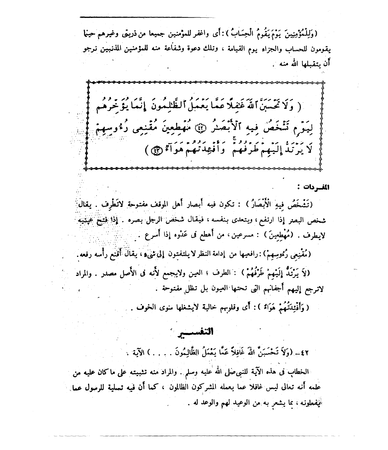 {وَلَا تَحْسَبَنَّ اللَّهَ غَافِلًا عَمَّا يَعْمَلُ الظَّالِمُونَ إِنَّمَا يُؤَخِّرُهُمْ لِيَوْمٍ تَشْخَصُ فِيهِ الْأَبْصَارُ (42) مُهْطِعِينَ مُقْنِعِي رُءُوسِهِمْ لَا يَرْتَدُّ إِلَيْهِمْ طَرْفُهُمْ وَأَفْئِدَتُهُمْ هَوَاءٌ (43)}