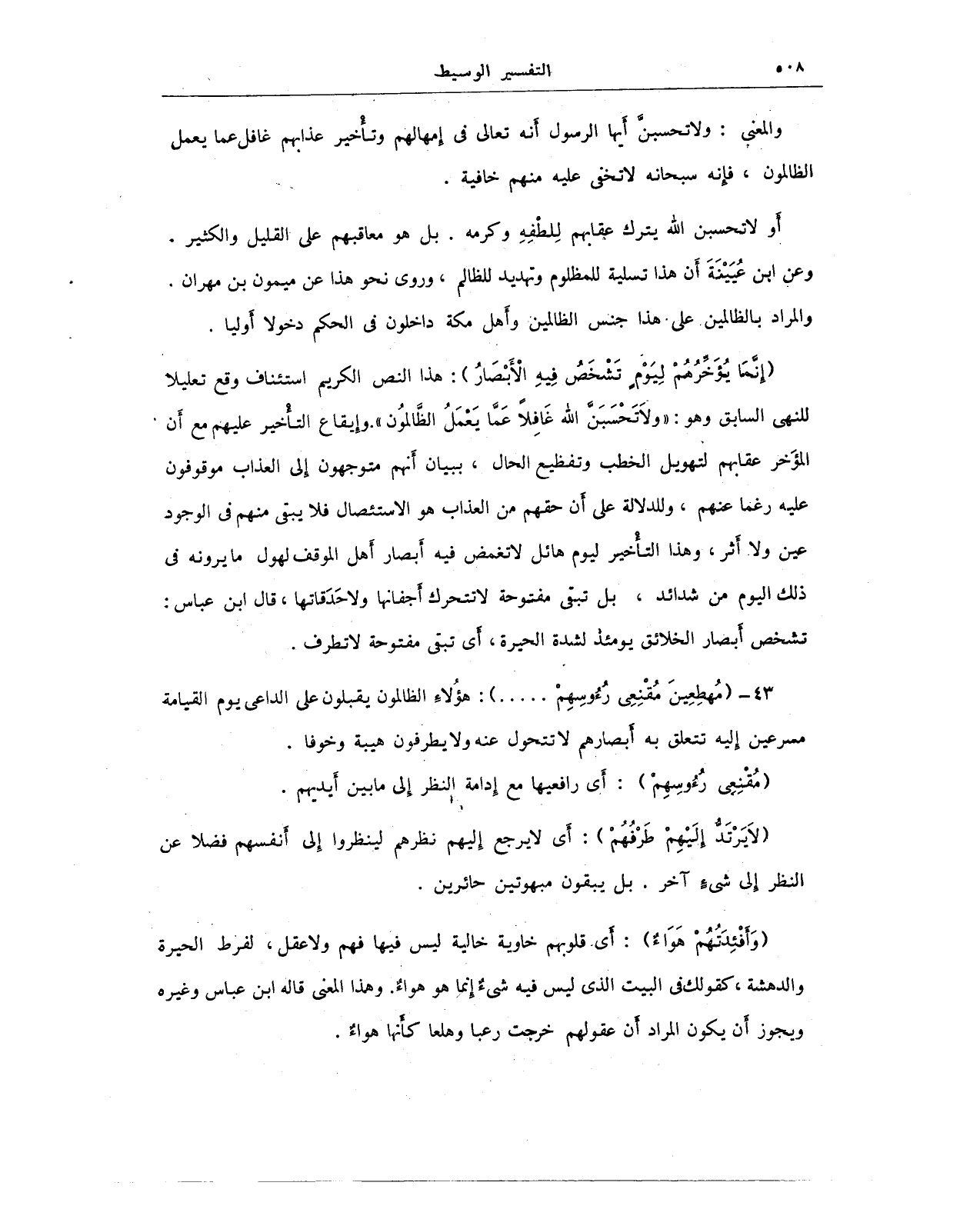 43 - (مُهْطِعِينَ مُقْنِعِي رُءُوسِهِمْ ... ): هؤُلاءِ الظالمون يقبلون على الداعى يوم القيامة مسرعين إِليه تتعلق به أَبصارهم لا تتحول عنه ولا يطرفون هيبة وخوفا.