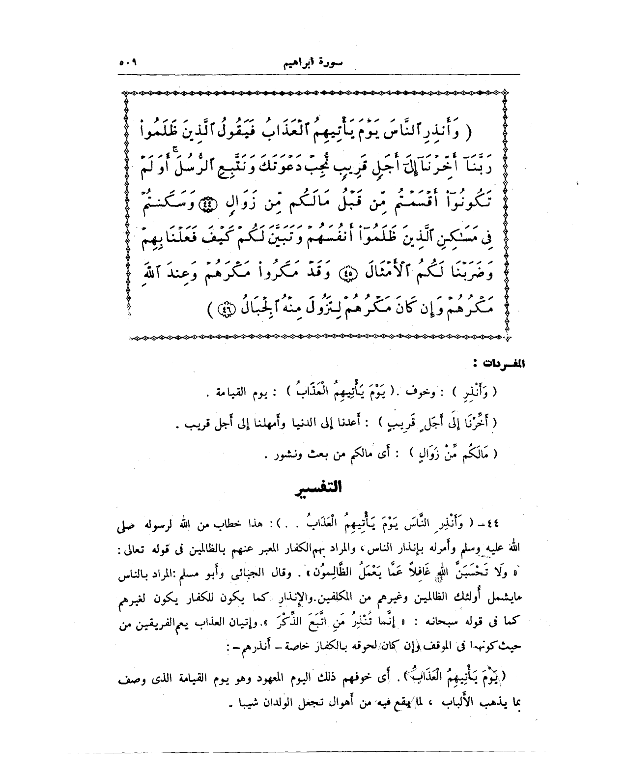 44 - (وَأَنْذِرِ النَّاسَ يَوْمَ يَأْتِيهِمُ الْعَذَابُ ... ): هذا خطاب من الله لرسوله صلى الله عليه وسلم وأَمر له بإِنذار الناس، والمراد بهم الكفار المعبر عنهم بالظالمين في قوله تعالى: (وَلَا تَحْسَبَنَّ اللَّهَ غَافِلًا عَمَّا يَعْمَلُ الظَّالِمُونَ". وقال الجبائى وأَبو مسلم: المراد بالناس ما يشمل أُولئك الظالمين وغيرهم من المكلفين والإِنذار كما يكون للكفار يكون لغيرهم كما في قوله سبحانه: "إِنَّما تُنْذِرُ مَنِ اتّبَعَ الذِّكْرَ". وإِتيان العذاب يعم الفريقين من حيث كونها في الموقف وإِن كان لحوقه بالكفار خاصة -أَنذرهم-: