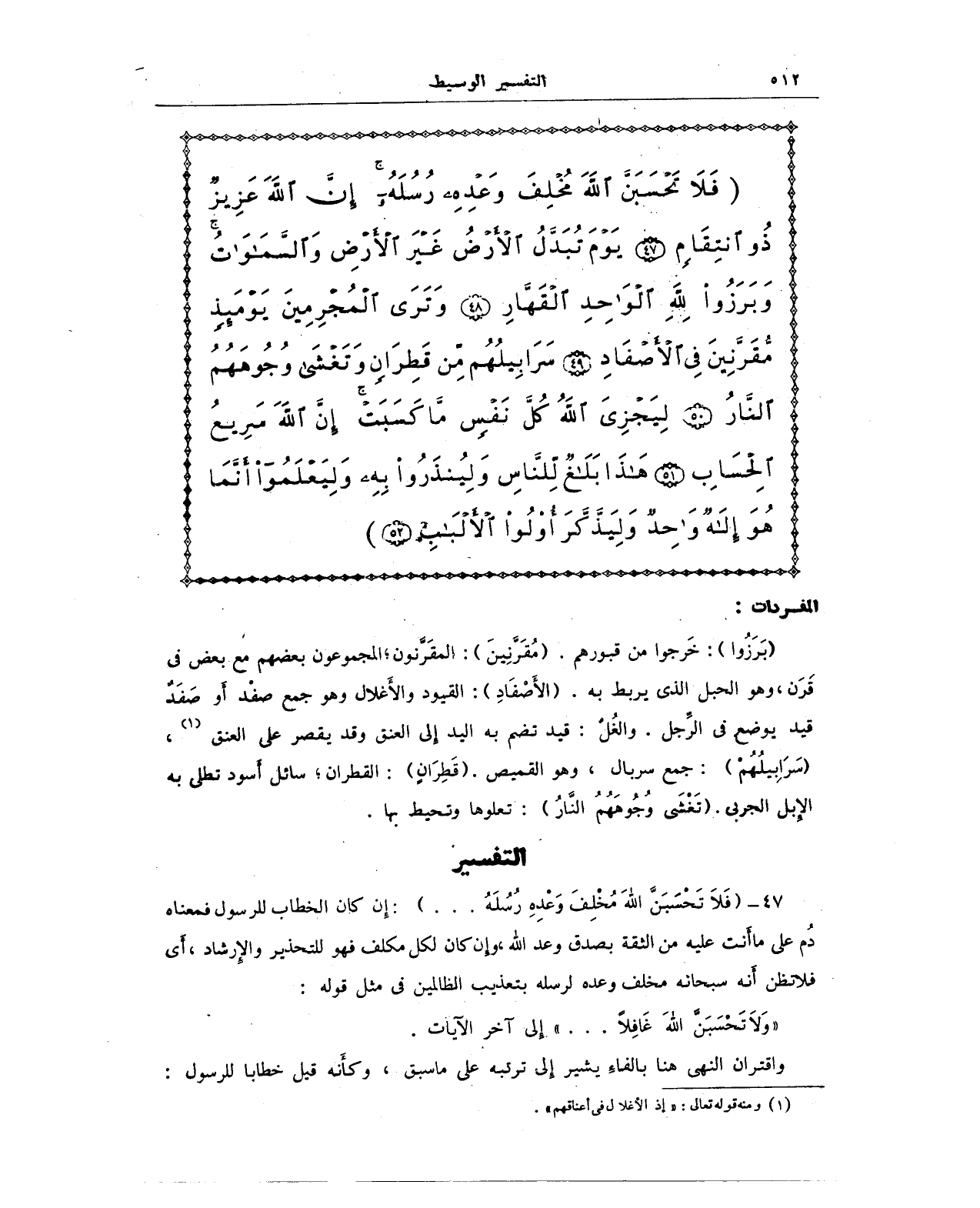 47 - (فَلَا تَحْسَبَنَّ اللَّهَ مُخْلِفَ وَعْدِهِ رُسُلَهُ .... ): إِن كان الخطاب للرسول فمعناه دُم على ما أَنت عليه من الثقة بصدق وعد الله، وإن كان لكل مكلف فهو للتحذير والإِرشاد، أَي فلا تظن أَنه سبحانه مخلف وعده لرسله بتعذيب الظالمين في مثل قوله: