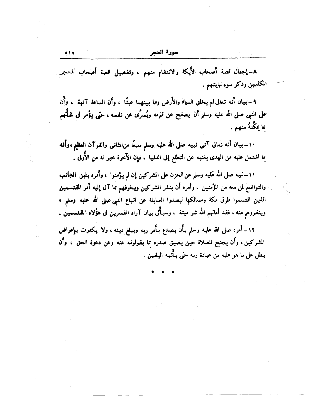 11 - نهيه صلى الله عَليه وسلم عن الحزن على المشركين إِن لم يؤمنوا، وأَمره بلين الجانب والتواضع لمن معه من المؤمنين، وأَمره أَن ينذر المشركين ويخوفهم مما آل إِليه أَمر المقتسمين الذين اقتسموا طرق مكة ومسالكها ليصدوا السابلة عن اتباع النبي صلى الله عليه وسلم، وينفروهم منه، فقد أَماتهم الله شر ميتة، وسيأْتى بيان آراه المفسرين في هؤُلاءِ المقتسمين.