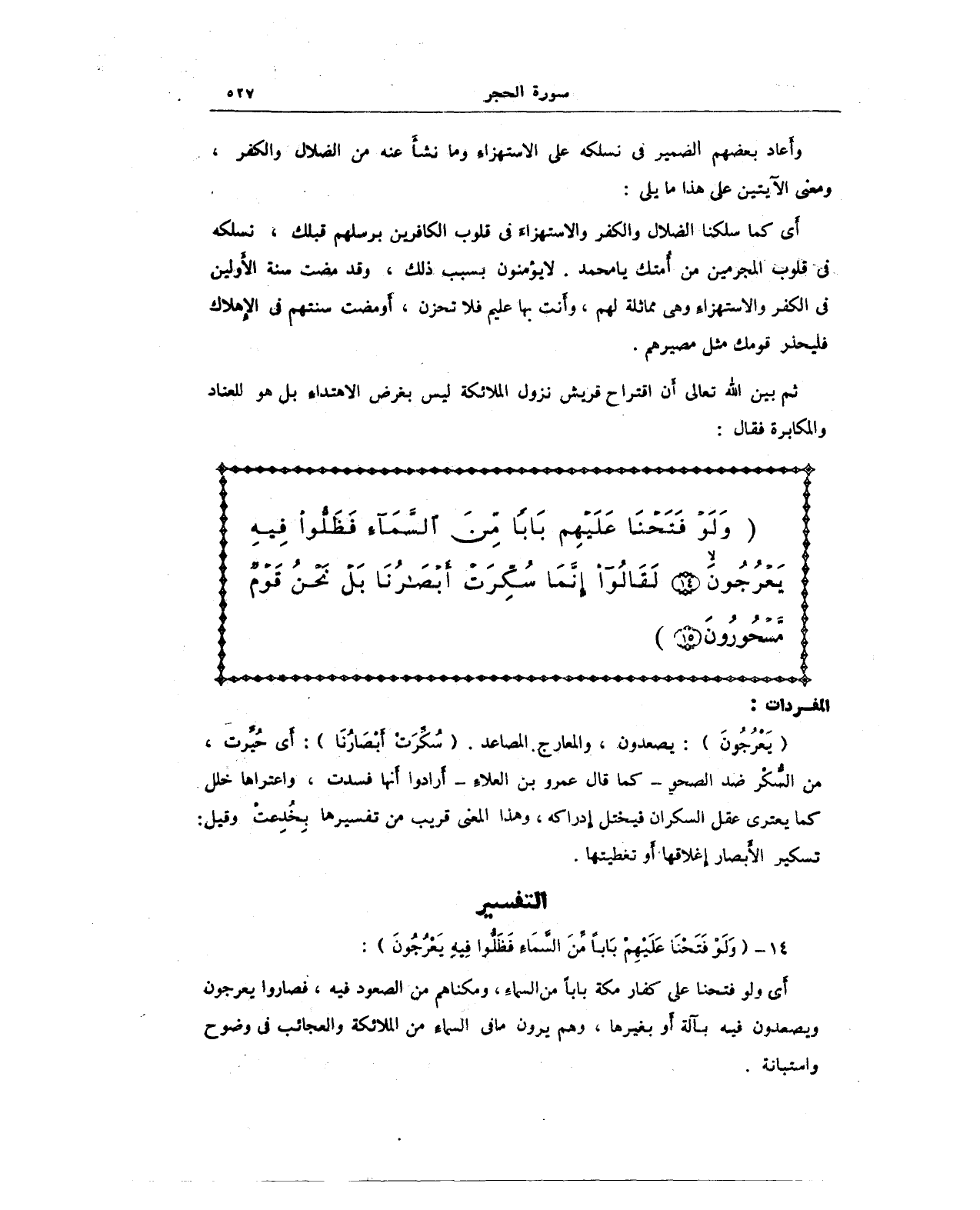 {وَلَوْ فَتَحْنَا عَلَيْهِمْ بَابًا مِنَ السَّمَاءِ فَظَلُّوا فِيهِ يَعْرُجُونَ (14) لَقَالُوا إِنَّمَا سُكِّرَتْ أَبْصَارُنَا بَلْ نَحْنُ قَوْمٌ مَسْحُورُونَ (15)}