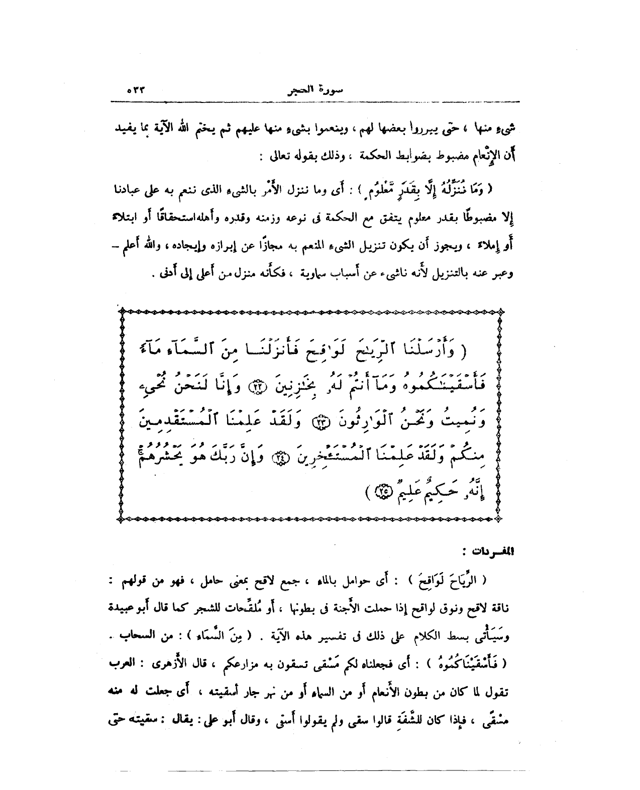 (الرِّيَاحَ لَوَاقِحَ): أَي حوامل بالماءِ، جمع لاقح بمعنى حامل، فهو من قولهم: ناقة لاقح ونوق لواقح إِذا حملت الأَجنة في بطونها، أَو مُلقِّحات للشجر كما قال أَبو عبيدة وسَيَأتى بسط الكلام على ذلك في تفسير هذه الآية (مِنَ السَّمَاءِ): من السحاب. (فَأَسْقَيْنَاكُمُوهُ): أَي فجعلناه لكم مَسْقى تسقون به مزارعكم، قال الأزهرى: العرب تقول لما كان من بطون الأَنعام أَو من السماءِ أَو من نهر جار أَسقيته، أَي جعلت له منه مسْقًى، فإِذا كان للشَّفَةِ قالوا سقى ولم يقولوا أَسقى، وقال أبو على: يقال: سقيته حتى