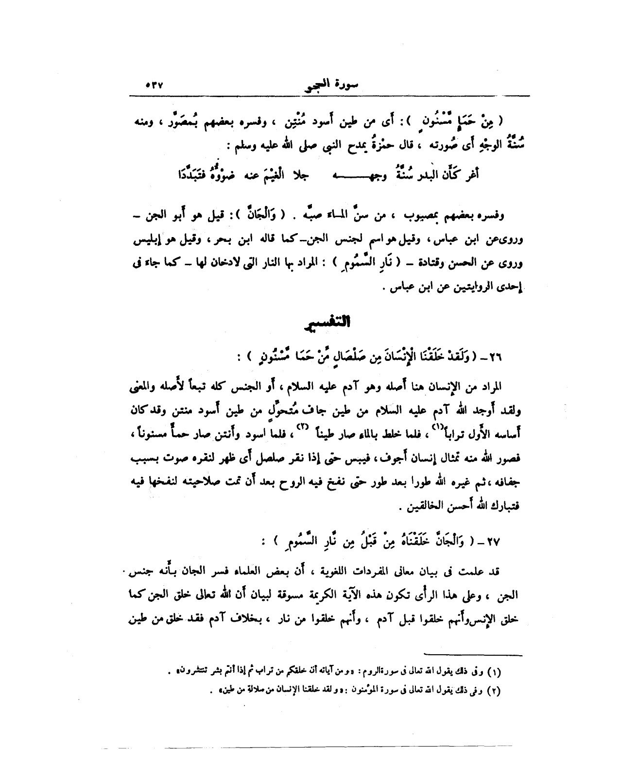 وفسره بعضهم بمصبوب، من سنَّ الماءَ صبَّه. (وَالْجَانَّ): قيل هو أَبو الجن -وروى عن ابن عباس، وقيل هو اسم لجنس الجن- كما قاله ابن بحر، وقيل هو إِبليس وروى عن الحسن وقتادة - (نَارِ السَّمُومِ): المراد بها النار التي لا دخان لها- كما جاءَ في إِحدى الروايتين عن ابن عباس.
