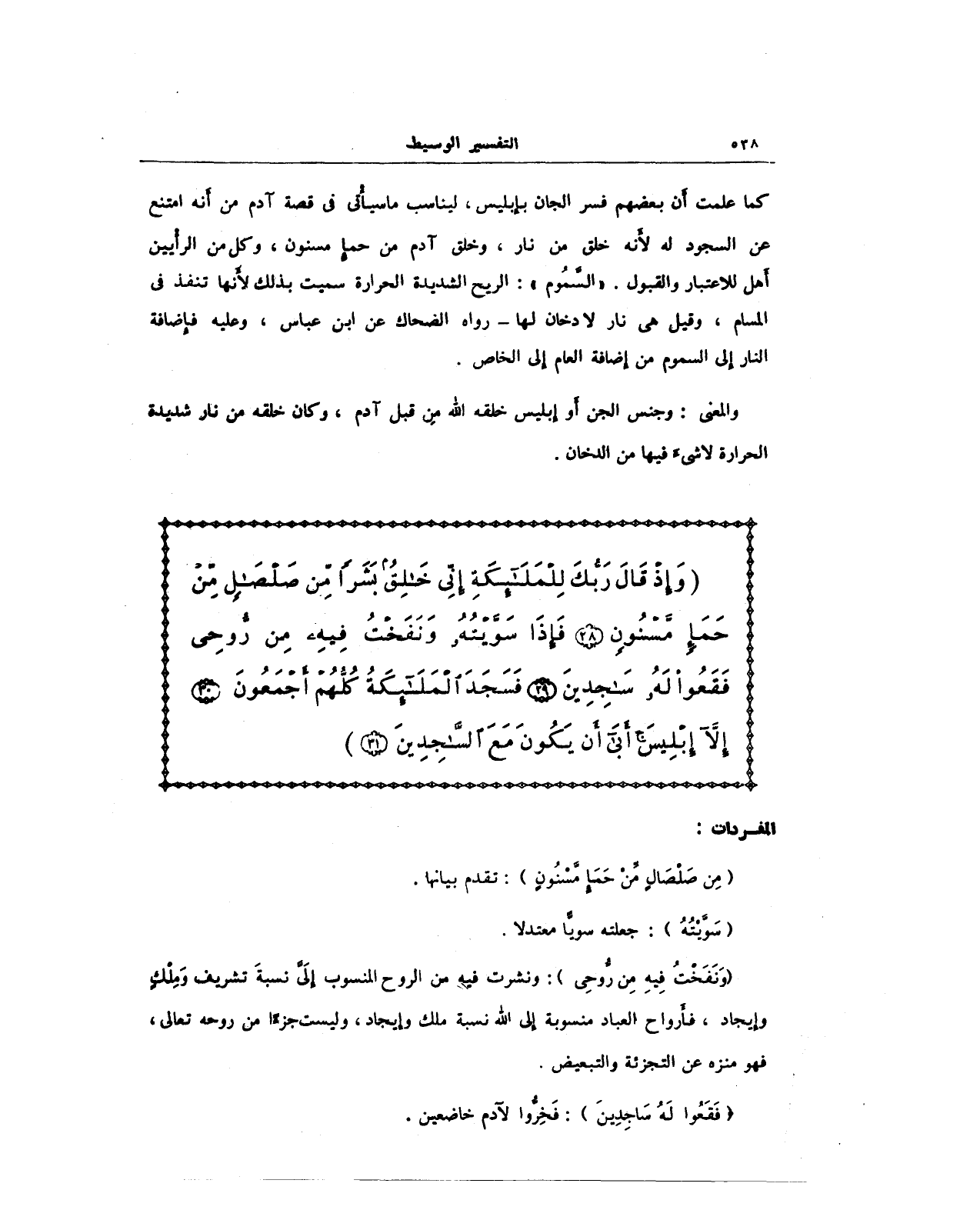 كما علمت أن بعضهم فسر الجان بإِبليس، ليناسب ما سيأْتى في قصة آدم من أَنه امتنع عن السجود له لأَنه خلق من نار، وخلق آدم من حمإٍ مسنون، وكل من الرأْيين أَهل للاعتبار والقبول. (السَّمُوم): الريح الشديدة الحرارة سميت بذلك لأَنها تنفذ في المسام، وقيل هي نار لا دخان لها -رواه الضحاك عن ابن عباس، وعليه فإِضافة النار إِلى السموم من إِضافة العام إِلى الخاص.