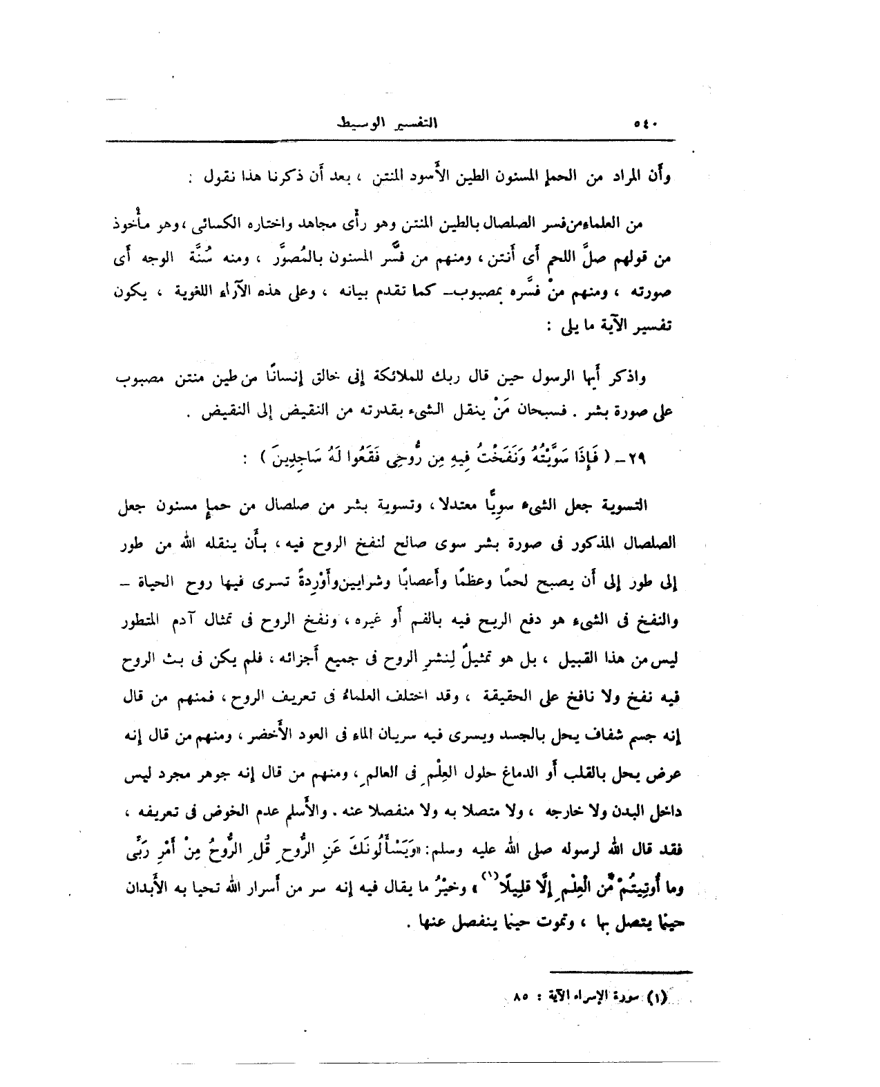 التسوية جعل الشيءِ سوِيَّا معتدلا، وتسوية بشر من صلصال من حمإِ مسنون جعل الصلصال المذكور في صورة بشر سوى صالح لنفخ الروح فيه، بأَن ينقله الله من طور إِلى طور إِلى أَن يصبح لحمًا وعظمًا وأَعصابًا وشرايين وأَورِدةً تسرى فيهًا روح الحياة -والنفخ في الشيءِ هو دفع الريح فيه بالفم أَو غيره، ونفخ الروح في تمثال آدم المتطور ليس من هذا القبيل، بل هو تمثيل لِنشرِ الروح في جميع أَجزائه، فلم يكن في بث الروح فيه نفخ ولا نافخ على الحقيقة، وقد اختلف العلماءُ في تعريف الروح، فمنهم من قال أَنه جسم شفاف يحل بالجسد ويسرى فيه سريان الماءِ في العود الأَخضر، ومنهم من قال أَنه عرض يحل بالقلب أَو الدماغ حلول العِلْمِ في العالمِ، ومنهم من قال إِنه جوهر مجرد ليس داخل البدن ولا خارجه، ولا متصلًا به ولا منفصلًا عنه. والأَسلم عدم الخوض في تعريفه، فقد قال الله لرسوله صلى الله عليه وسلم "وَيَسْأَلُونَكَ عَنِ الرُّوحِ قُلِ الرُّوحُ مِنْ أَمْرِ رَبِّي وَمَا أُوتِيتُمْ مِنَ الْعِلْمِ إِلَّا قَلِيلًا (¬1) " وخيْرُ ما يقال فيه إِنه سر من أَسرار الله تحيا به الأَبدان حينما يتصل بها، وتموت حينما ينفصل عنها.
