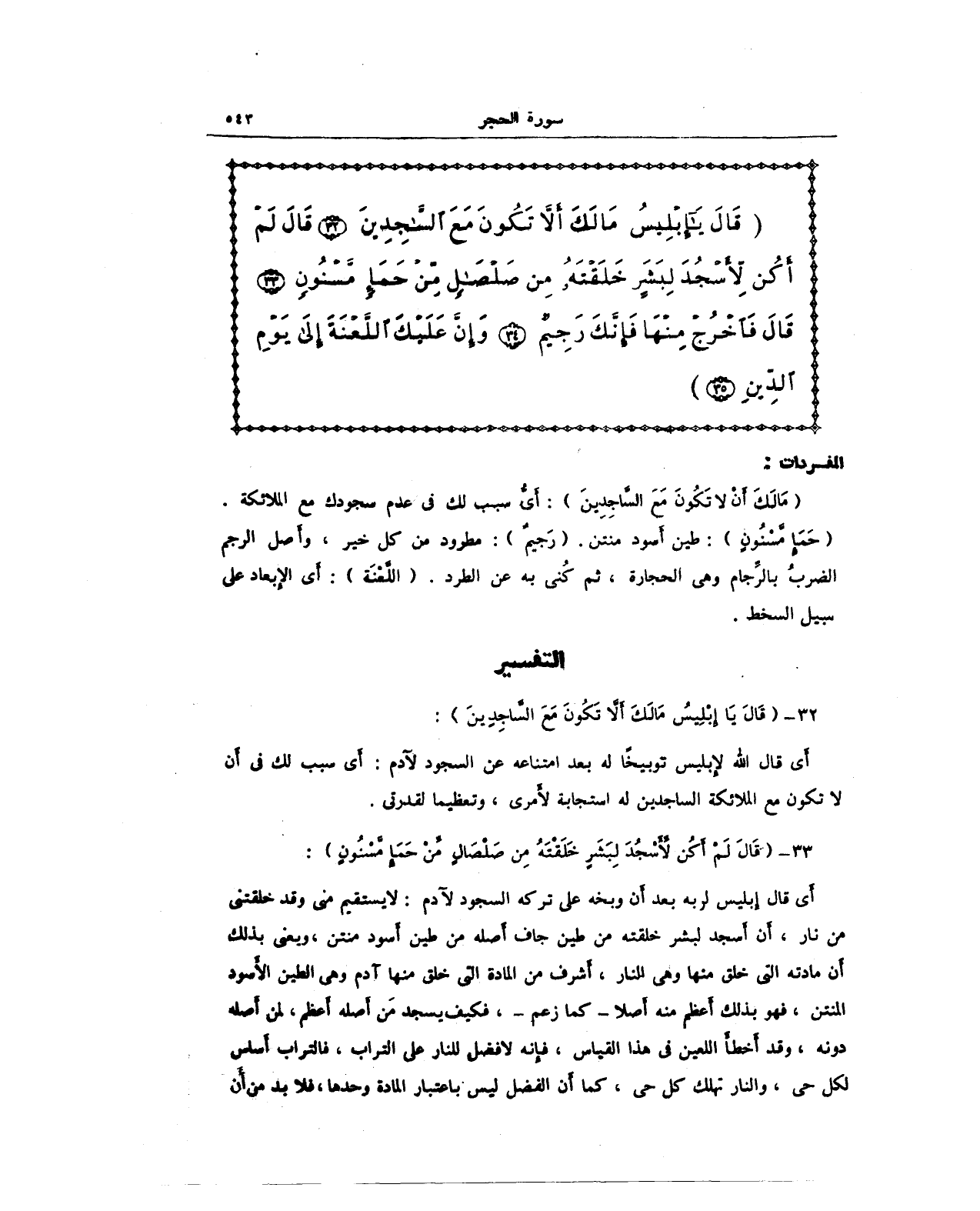 (مَا لَكَ أَلَّا تَكُونَ مَعَ السَّاجِدِينَ): أَىُّ سبب لك في عدم سجودك مع الملائكة. (حَمَإٍ مَسْنُونٍ): طين أسود منتن. (رَجِيمٌ): مطرود من كل خير، وأَصل الرجم الضربُ بالرَّجام وهي الحجارة، ثم كُنى به عن الطرد. (اللَّعْنَةَ): أَي الإِبعاد على سبيل السخط.