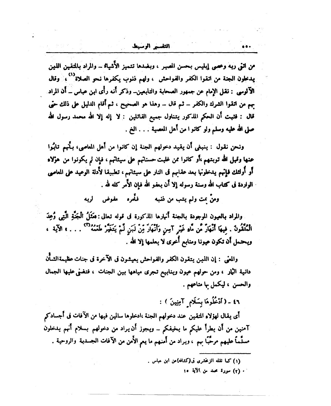والمراد بالعيون الموجودة بالجنة أَنهارها المذكورة في قوله تعالى: "مَثَلُ الْجَنَّةِ الَّتِي وُعِدَ الْمُتَّقُونَ فِيهَا أَنْهَارٌ مِنْ مَاءٍ غَيْرِ آسِنٍ وَأَنْهَارٌ مِنْ لَبَنٍ لَمْ يَتَغَيَّرْ طَعْمُهُ (¬2) .... " الآية، ويحتمل أَن تكون عيونا ومنابع أُخرى لا يعلمها إلا الله.