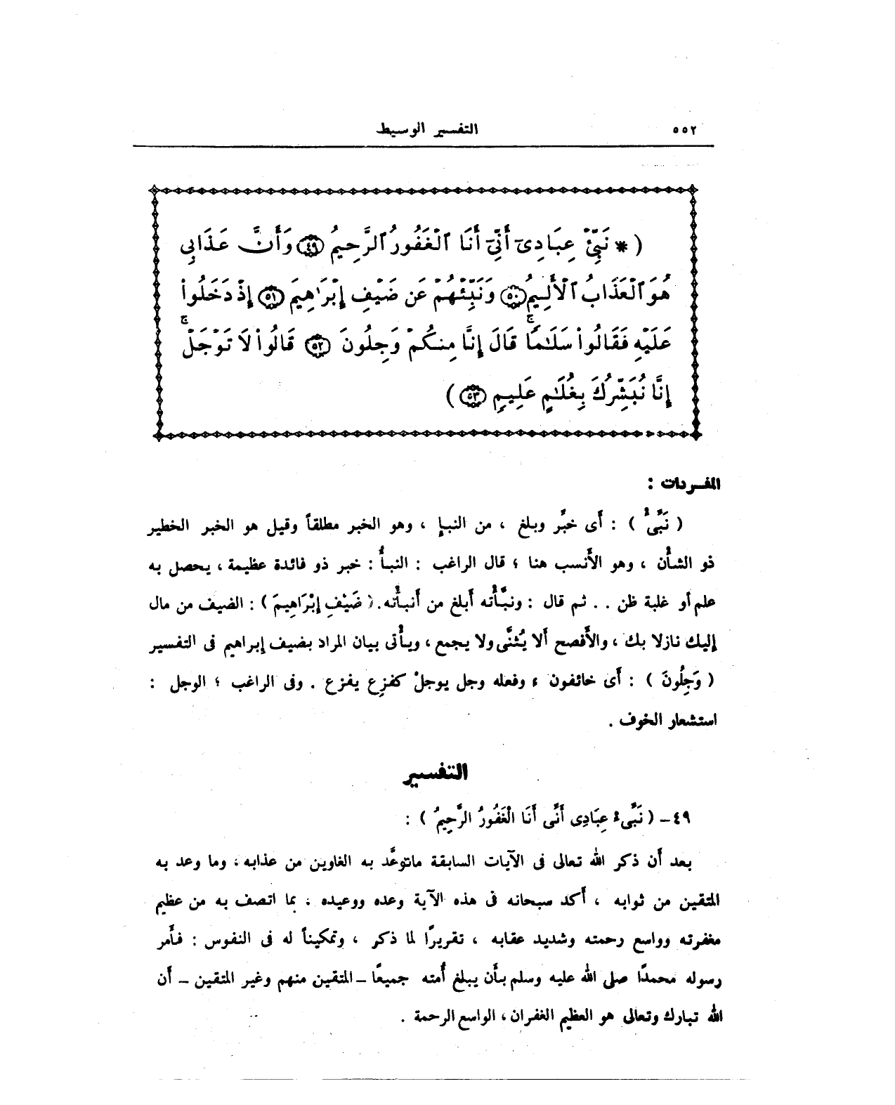 {*نَبِّئْ عِبَادِي أَنِّي أَنَا الْغَفُورُ الرَّحِيمُ (49) وَأَنَّ عَذَابِي هُوَ الْعَذَابُ الْأَلِيمُ (50) وَنَبِّئْهُمْ عَنْ ضَيْفِ إِبْرَاهِيمَ (51) إِذْ دَخَلُوا عَلَيْهِ فَقَالُوا سَلَامًا قَالَ إِنَّا مِنْكُمْ وَجِلُونَ (52) قَالُوا لَا تَوْجَلْ إِنَّا نُبَشِّرُكَ بِغُلَامٍ عَلِيمٍ (53)}