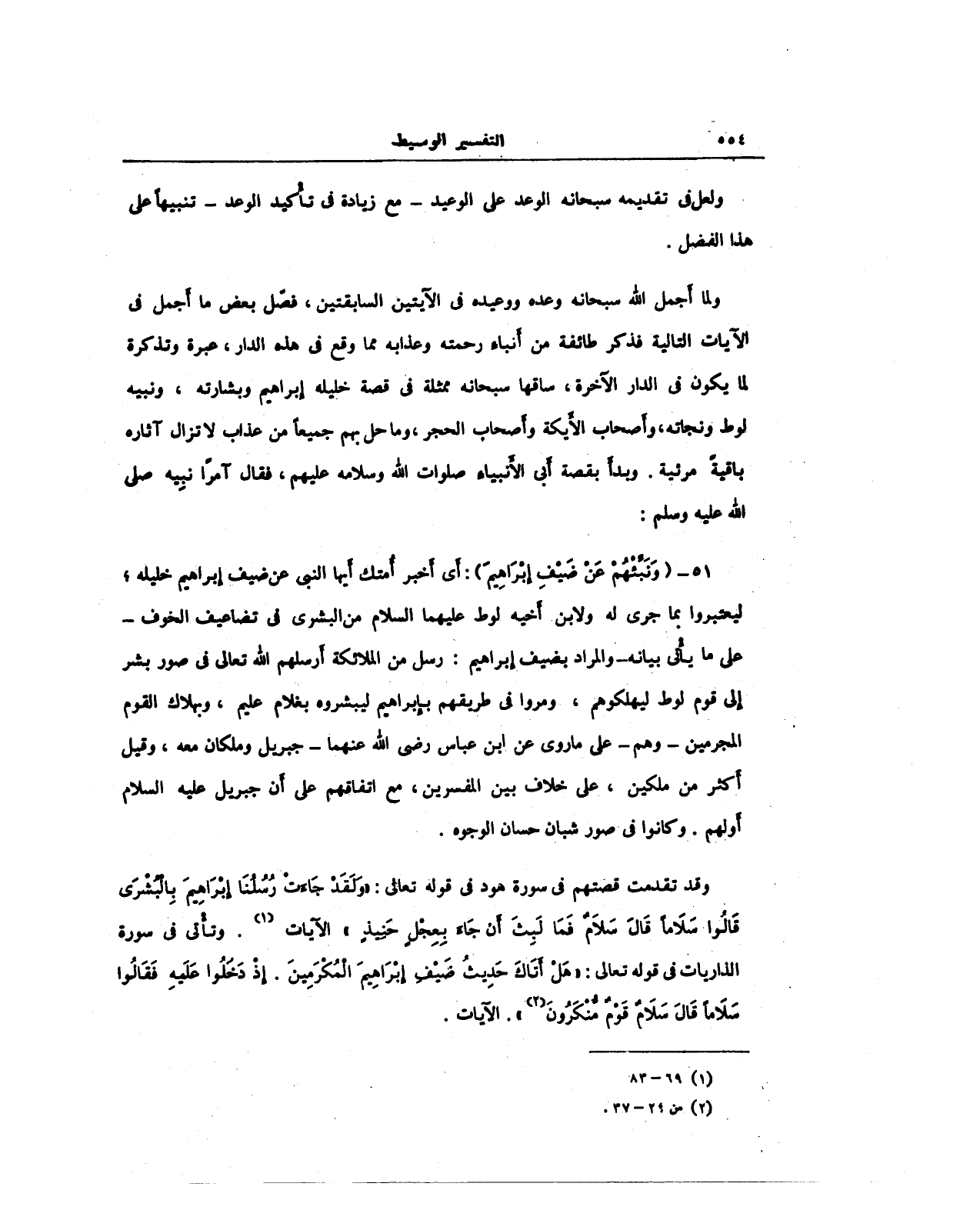 51 - (وَنَبِّئْهُمْ عَنْ ضَيْفِ إِبْرَاهِيمَ): أَي أَخبر أُمتك أَيها النبي عن ضيف إِبراهيم خليله؛ ليعتبروا بما جرى له ولابن أَخيه لوط عليهما السلام من البشرى في تضاعيف الخوف -على ما يأْتى بيانه- والمراد بضيف إِبراهيم: رسل من الملائكة أَرسلهم الله تعالى في صور بشر إِلى قوم لوط ليهلكوهم، ومروا في طريقهم بإِبراهيم ليبشروه بغلام عليم، وبهلاك القوم المجرمين -وهم- على ما روى عن ابن عباس رضي الله عنهما -جبريل وملكان معه، وقيل أَكثر من ملكين، على خلاف بين المفسرين، مع اتفاقهم على أَن جبريل عليه السلام أَولهم. وكانوا في صور شبان حسان الوجوه.