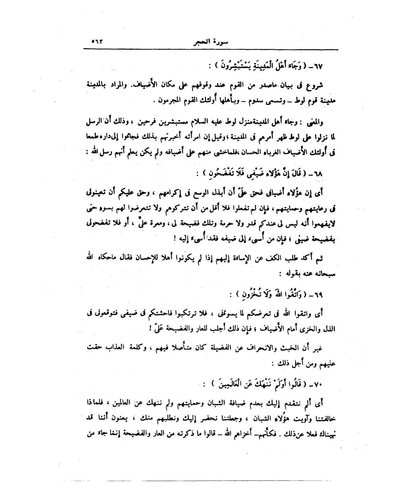 والمعنى: وجاء أَهل المدينة منزل لوط عليه السلام مستبشرين فرحين، وذلك أَن الرسل لما نزلوا على لوط ظهر أَمرهم في المدينة وقيل إِن امرأَته أَخبرتهم بذلك فجاءُوا إِلى داره طمعا في أُولئك الأَضياف الغرباءِ الحسان، فلما خشى منهم على أَضيافه ولم يكن يعلم أَنهم رسل الله:
