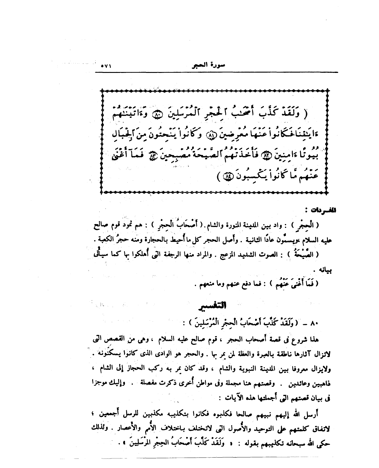 هذا شروع في قصة أَصحاب الحجر، قوم صالح عليه السلام، وهى من القصص التي لا تزال آثارها ناطقة بالعبرة والعظة لمن يمر بها. والحجر هوالوادى الذي كانوا يسكنونه. ولا يزال معروفا بين المدينة والشام، وقد كان يمر به راكب الحجاز إلى الشام، ذاهبين وعائدين. وقصتهم هنا مجملة وفي مواطن أُخرى ذكرت مفصلة. وإِليك موجزا في بيان قصتهم التي أَجملتها هذه الآيات:
