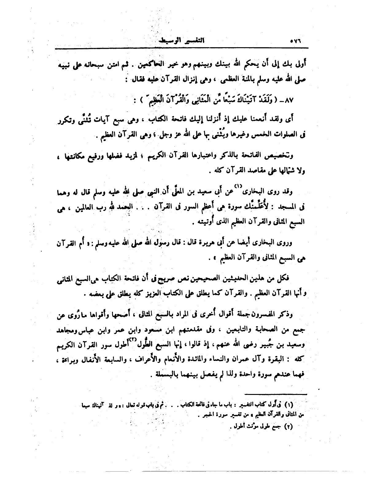 فكل من هذين الحديثين الصحيحين نص صريح في أَن فاتحة الكتاب هي السبع المثانى وأَنها القرآن العظيم. والقرآن كما يطلق على الكتاب العزيز كله يطلق عل بعضه.