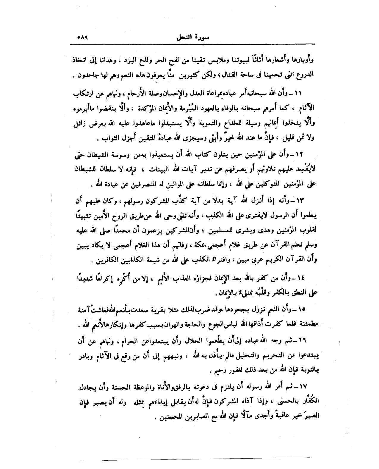 11 - وأن الله سبحانه أمر عباده بمراعاة العدل والإحسان وصلة الأرحام، ونهاهم عن ارتكاب الآثام، كما أمرهم سبحانه بالوفاء بالعهود المُبْرمة والأيمان المؤكدة، وألَّا ينقضوا ما أبرموه وألَّا يتخذوا أيمانهم وسيلة للخداع والتمويه وألا يستبدلوا ما عاهدوا عليه الله بعرض زائل ولا ثمن قليل، فإنَّ ما عند الله خيرٌ وأبقى وسيجزى الله عبادهُ المتقين أَجزل الثواب.