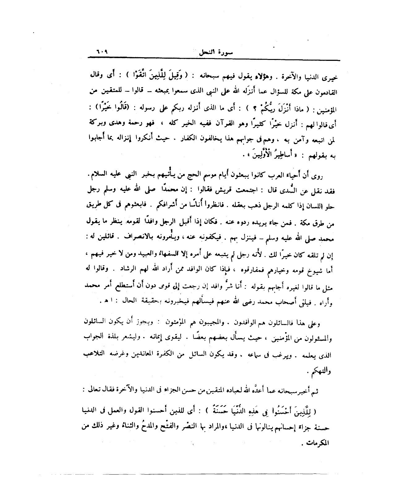 خيرى الدنيا والآخرة. وهؤلاء يقول فيهم سبحانه: (وَقِيلَ لِلَّذِينَ اتَّقَوْا): أي وقال القادمون على مكة للسؤال عمَّا أنزَله الله على النبي الذي سمعوا بمبعثه -قالوا- للمتقين من المؤمنين: (ماذا أنْزَلَ ربُّكم؟): أى ما الذى أنزله ربكم على رسوله: (قَالُوا خَيرًا): أي قالوا لهم: أنزل خيرًا كثيرًا وهو القرآن ففيه الخير كله، فهو رحمة وهدى وبركة لمن اتبعه وآمن به، وهم فى جوابهم هذا يخالفون الكفار. حيث أنكروا إنزاله بما أجابوا به بقولهم: "أساطِيرُ الأوَّلِينَ".